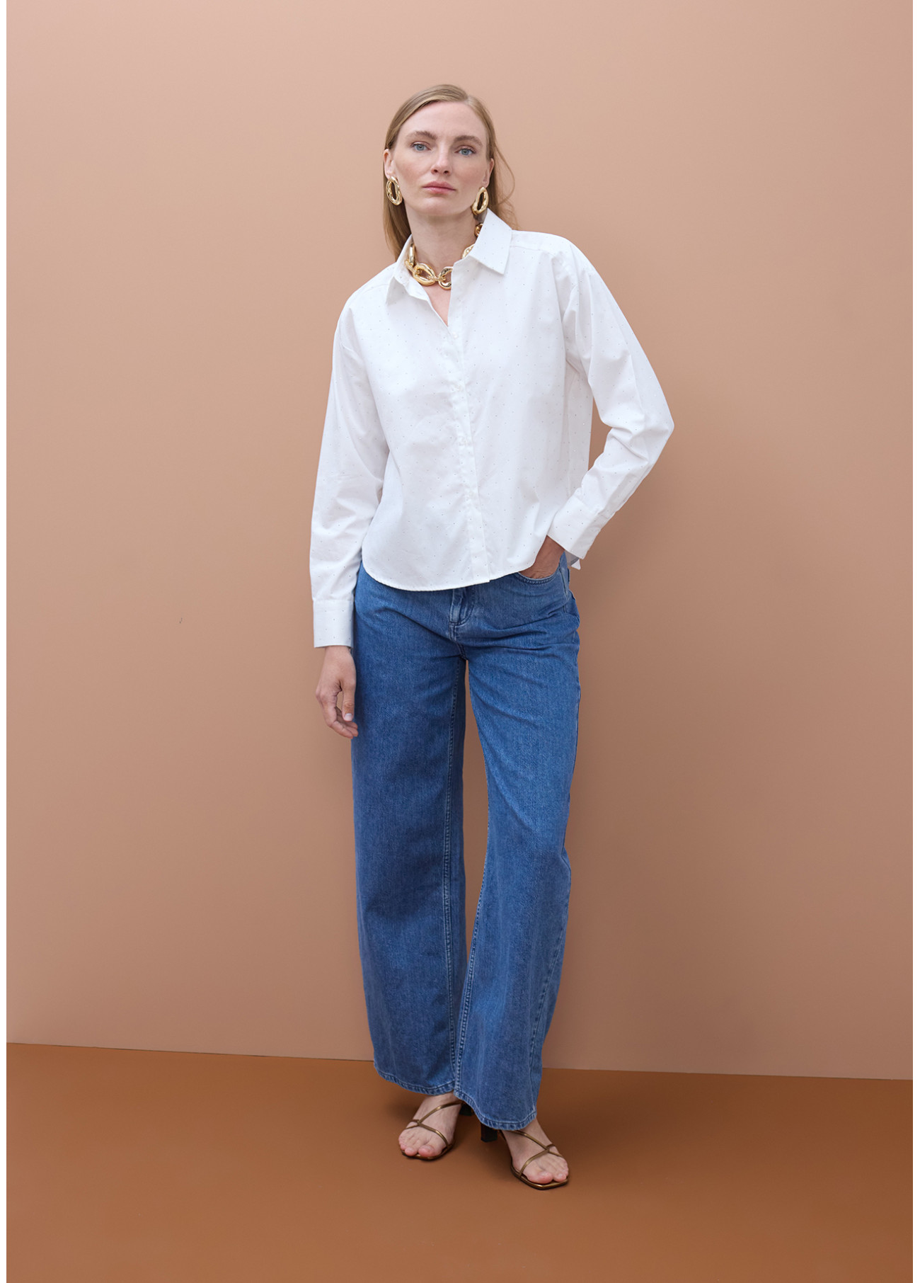 White poplin shirt featuring subtle estras details for added shine. Classic collar design, button front, and fitted long sleeves. Ideal for a sophisticated, modern look, perfect when paired with jeans or skirts for an elegant touch.
