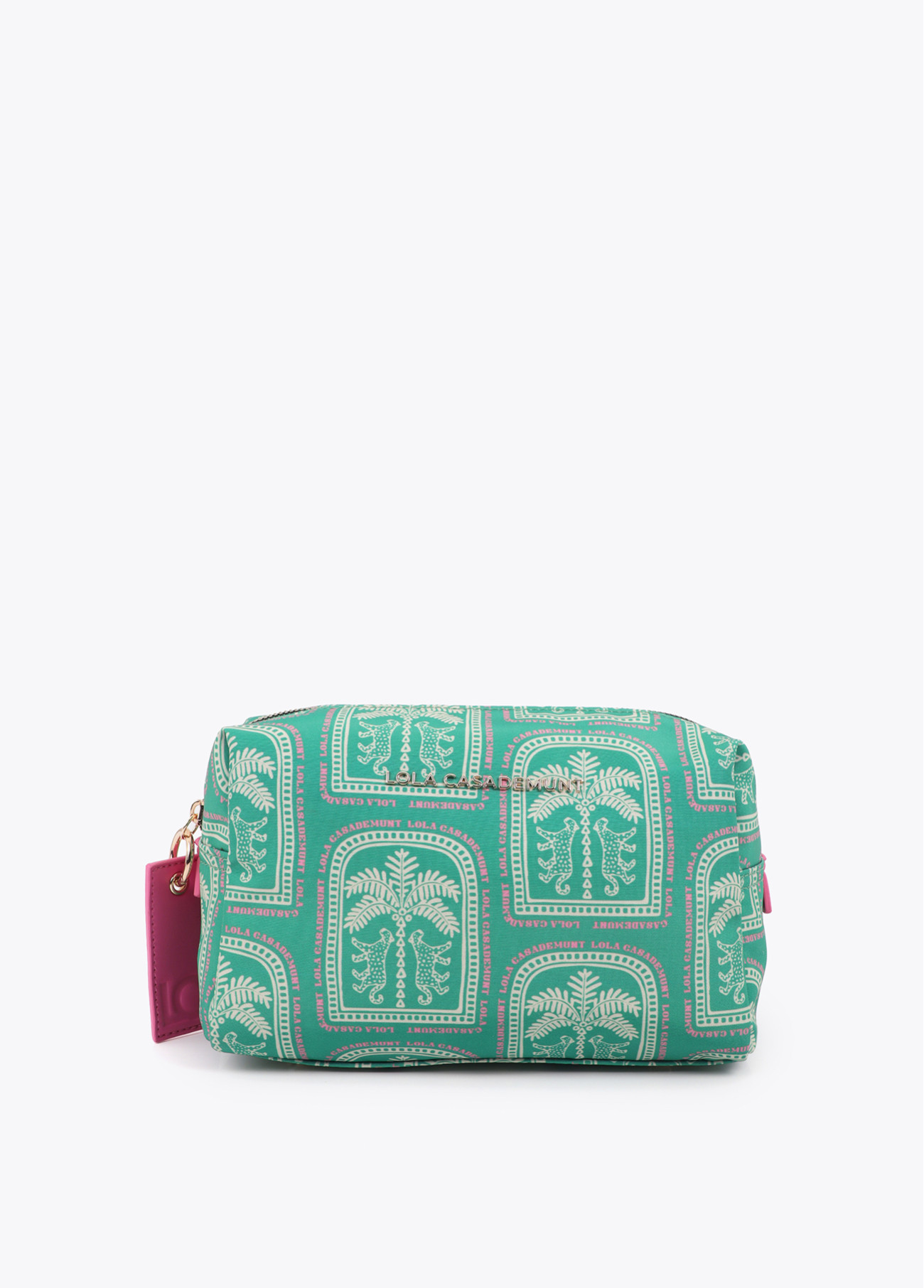 Nylon toiletry bag with a vibrant multicolor print. Features a metal zipper and pink faux leather puller. Perfect for carrying beauty products on trips or keeping organized at home.