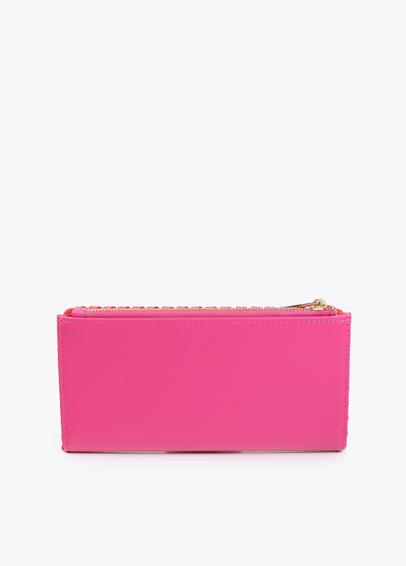 Stylish wallet in vibrant contrasting colors. Features a zipper closure and multiple card slots. Perfect for carrying essentials with style. Visible stitching adds a modern touch.