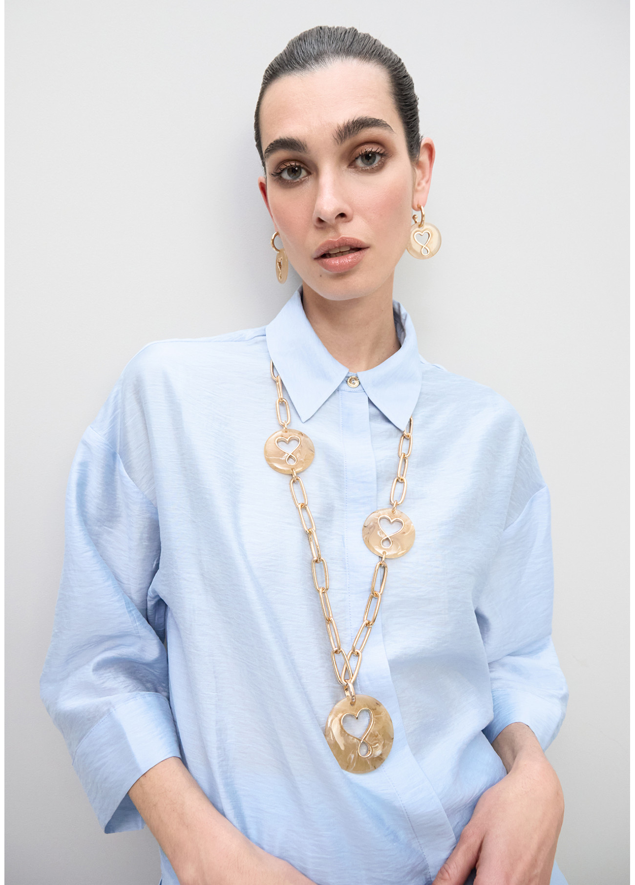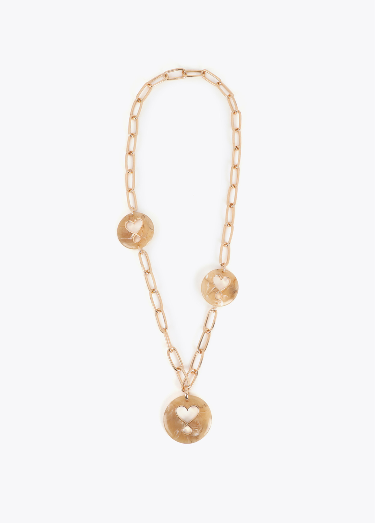 This long necklace features personalized acrylic medallions. Gold link chain adds an elegant and modern touch. Perfect for elevating any look with unique and sophisticated style.