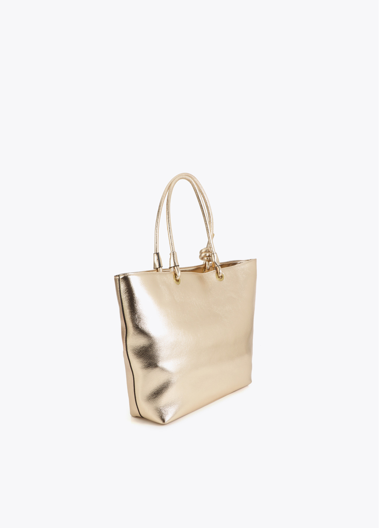 Unstructured shopper in shiny gold finish with embossed oval logo. Double intertwined handles and top zipper closure. Spacious interior with side pocket for organization. Perfect to add a glamorous touch to any outfit.