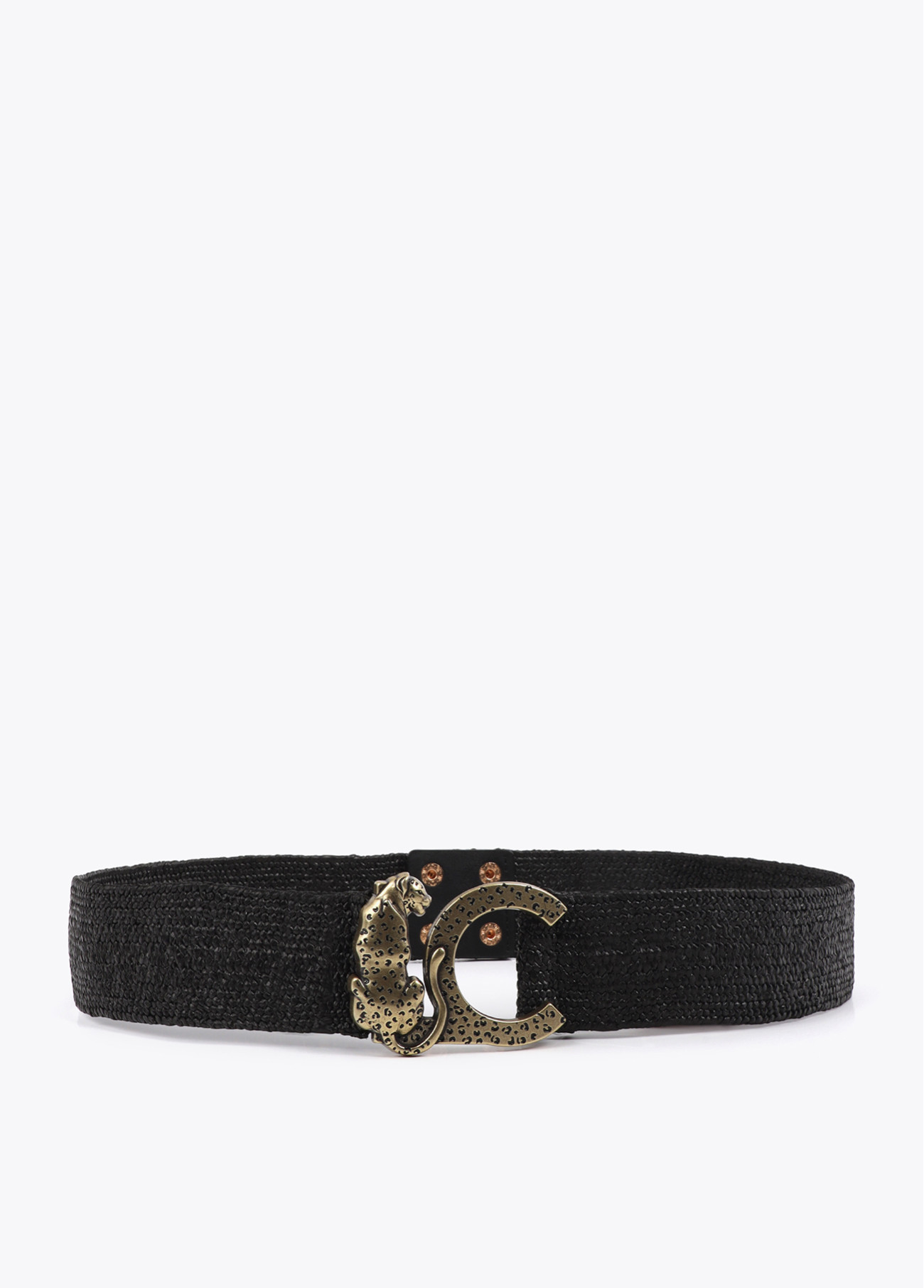 Elastic raffia belt featuring a distinctive animal logo buckle. Crafted from flexible material for a comfortable waist fit. Perfect for accessorizing any casual or formal look with a unique touch.