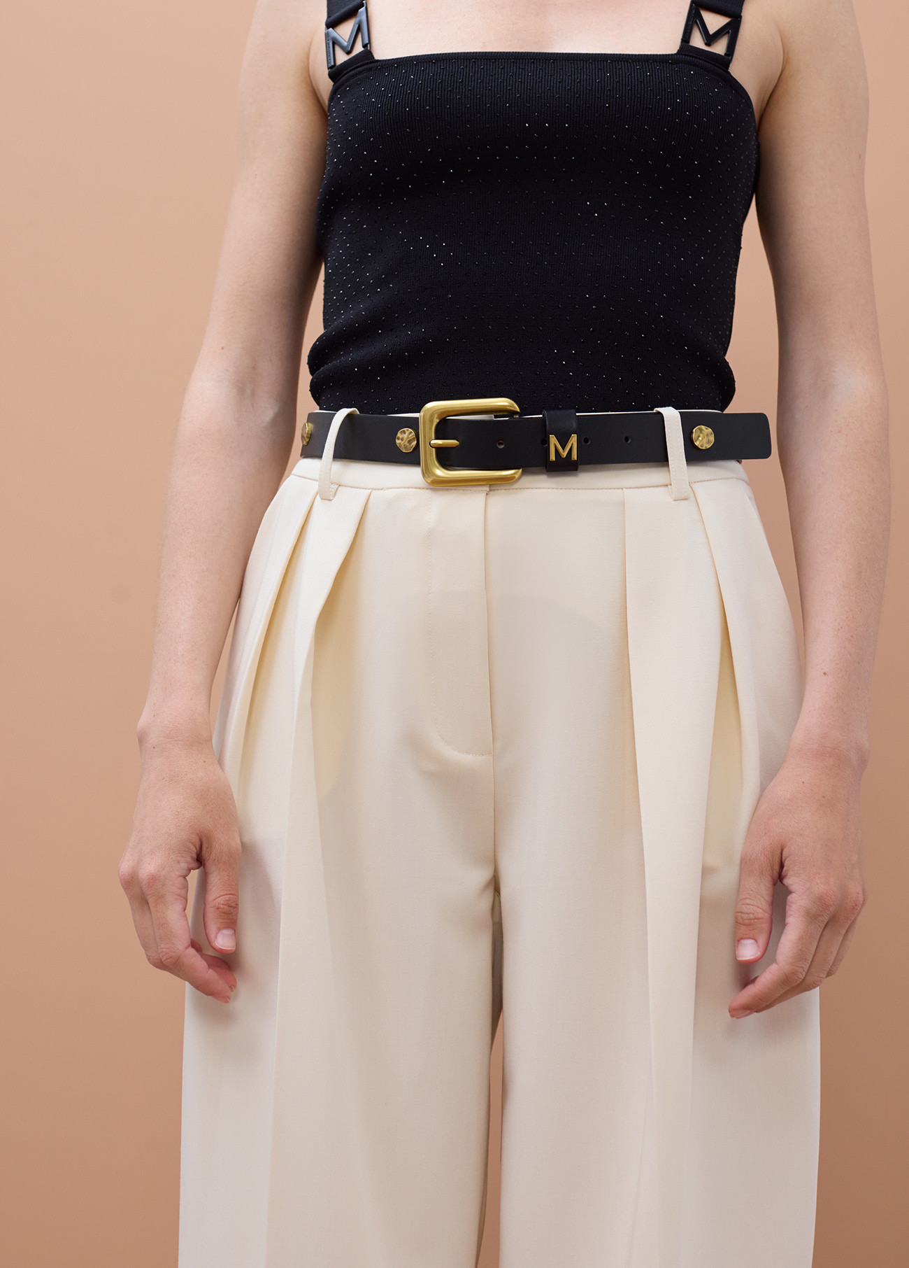 Black synthetic leather belt with a gold square buckle. Adorned with irregular studs for a modern and distinctive touch. Brand logo on the loop for a stylish finish.