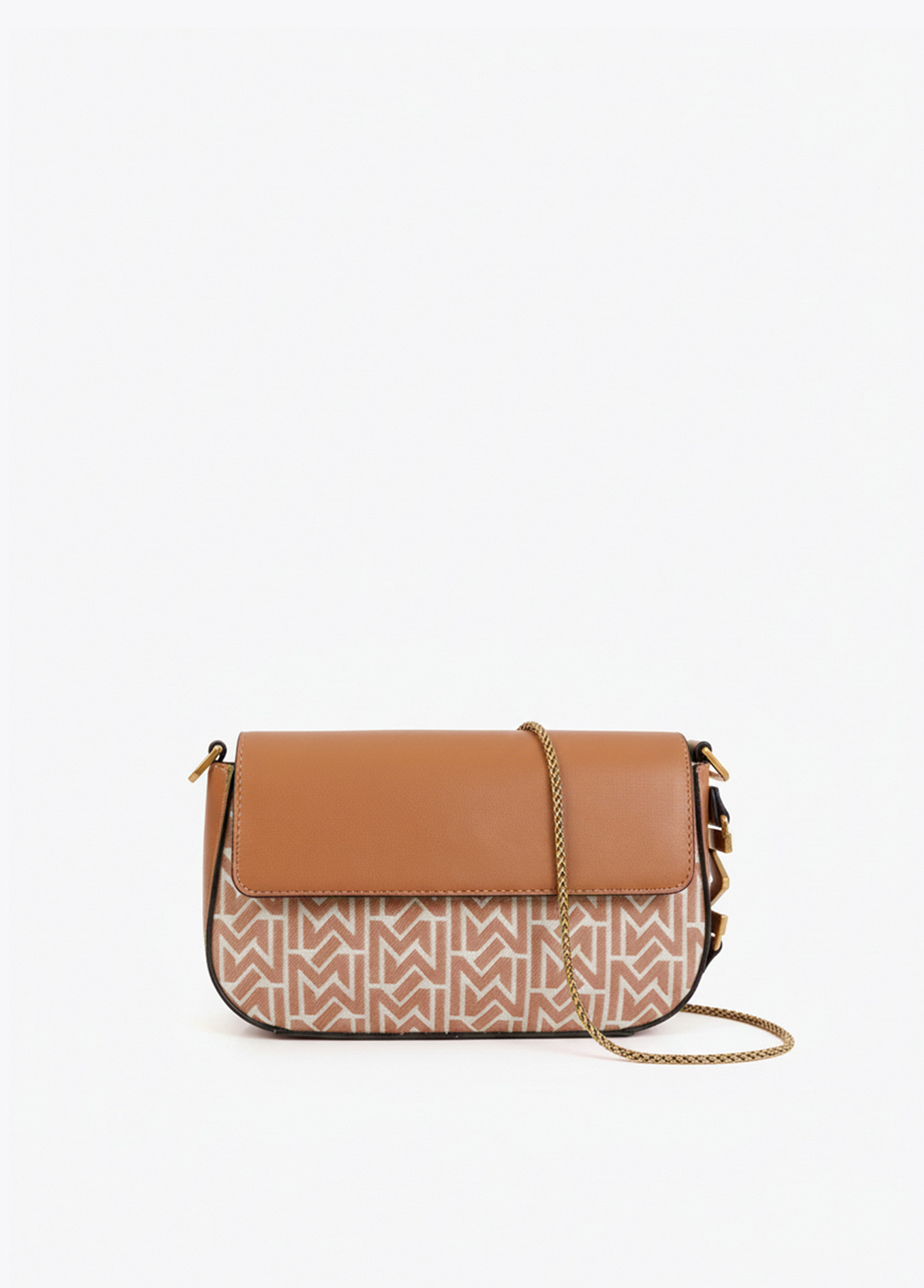 Elegant crossbody with faux leather flap and jacquard fabric body. Magnetic closure and adjustable gold chain. Merges style and functionality with interior pockets and sophisticated design.