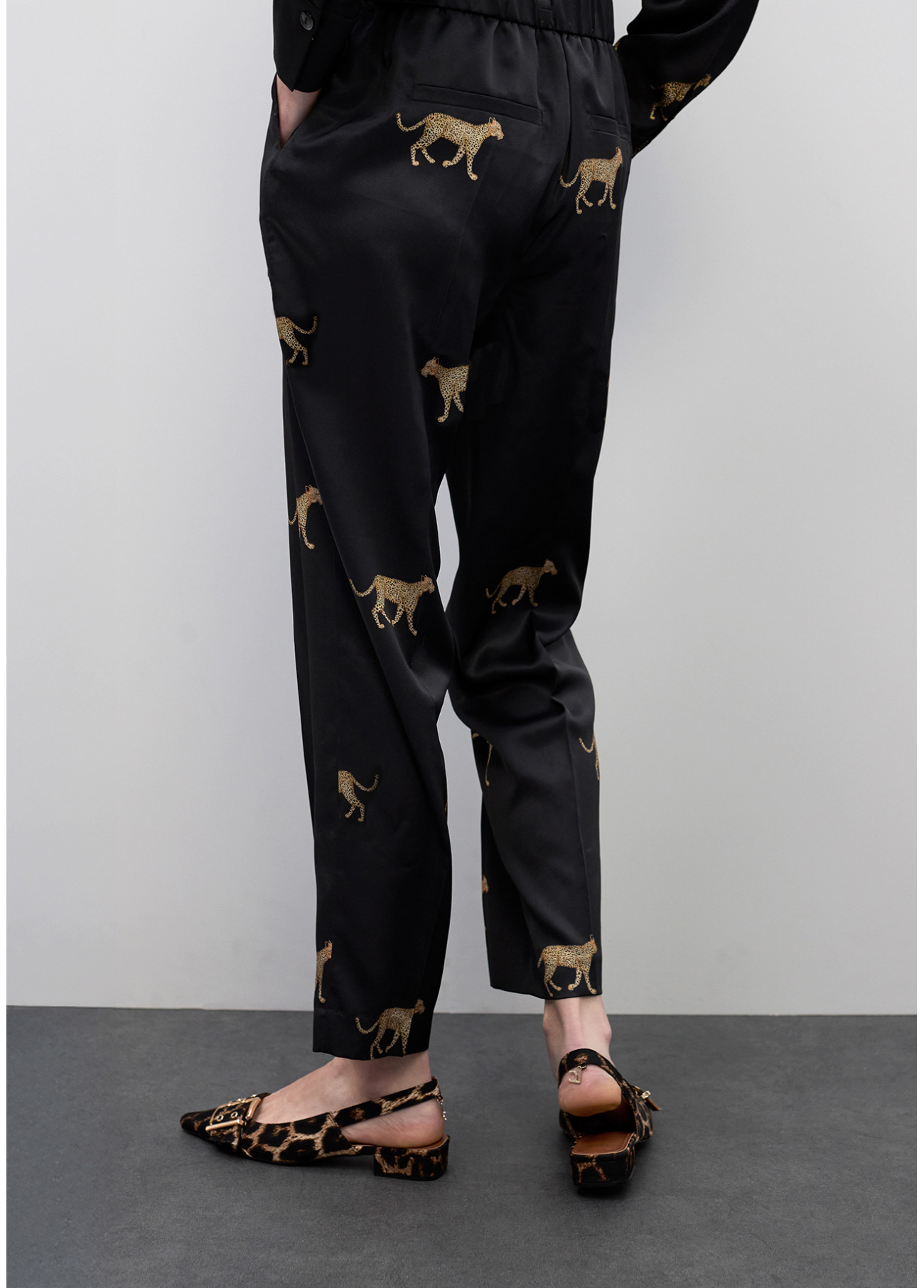 Satin jogger with leopard print. Features an adjustable elastic waistband and side pockets for comfort. Ideal for a casual look with a bold and elegant touch. Perfect to pair with plain shirts or tops to stand out on any occasion.