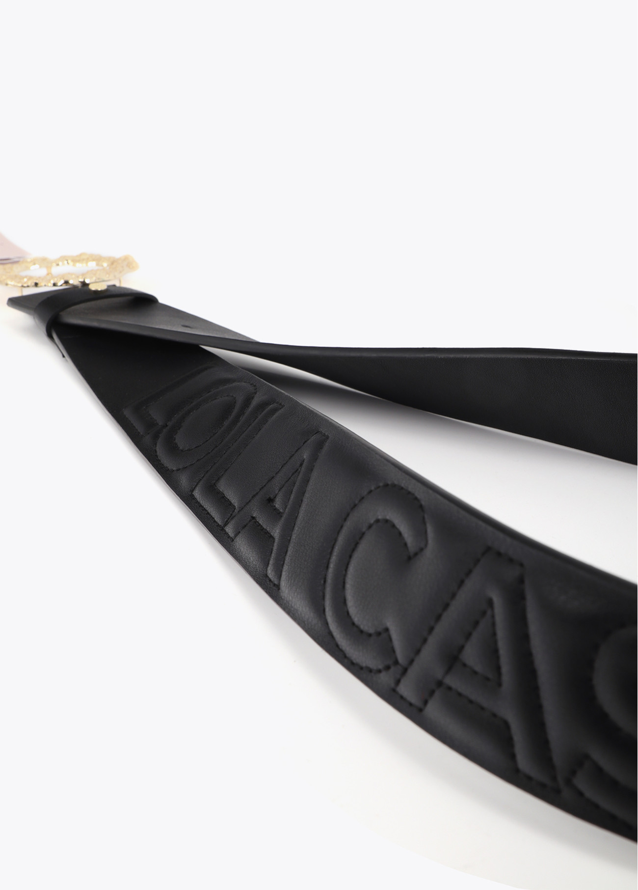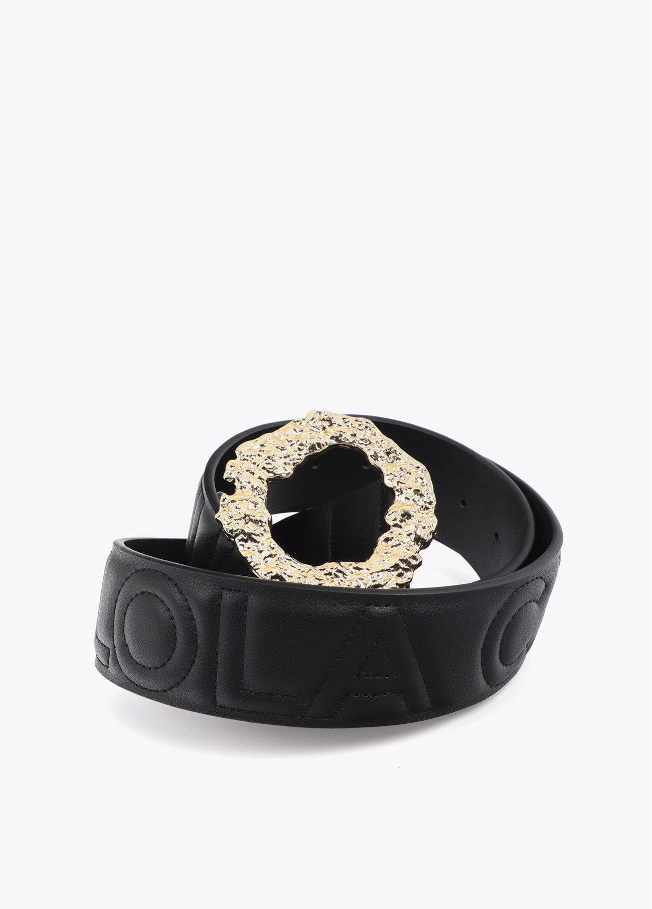 Leather belt with irregular engraved buckle and texture. Logo stitching details add an exclusive touch. Perfect to elevate any outfit.