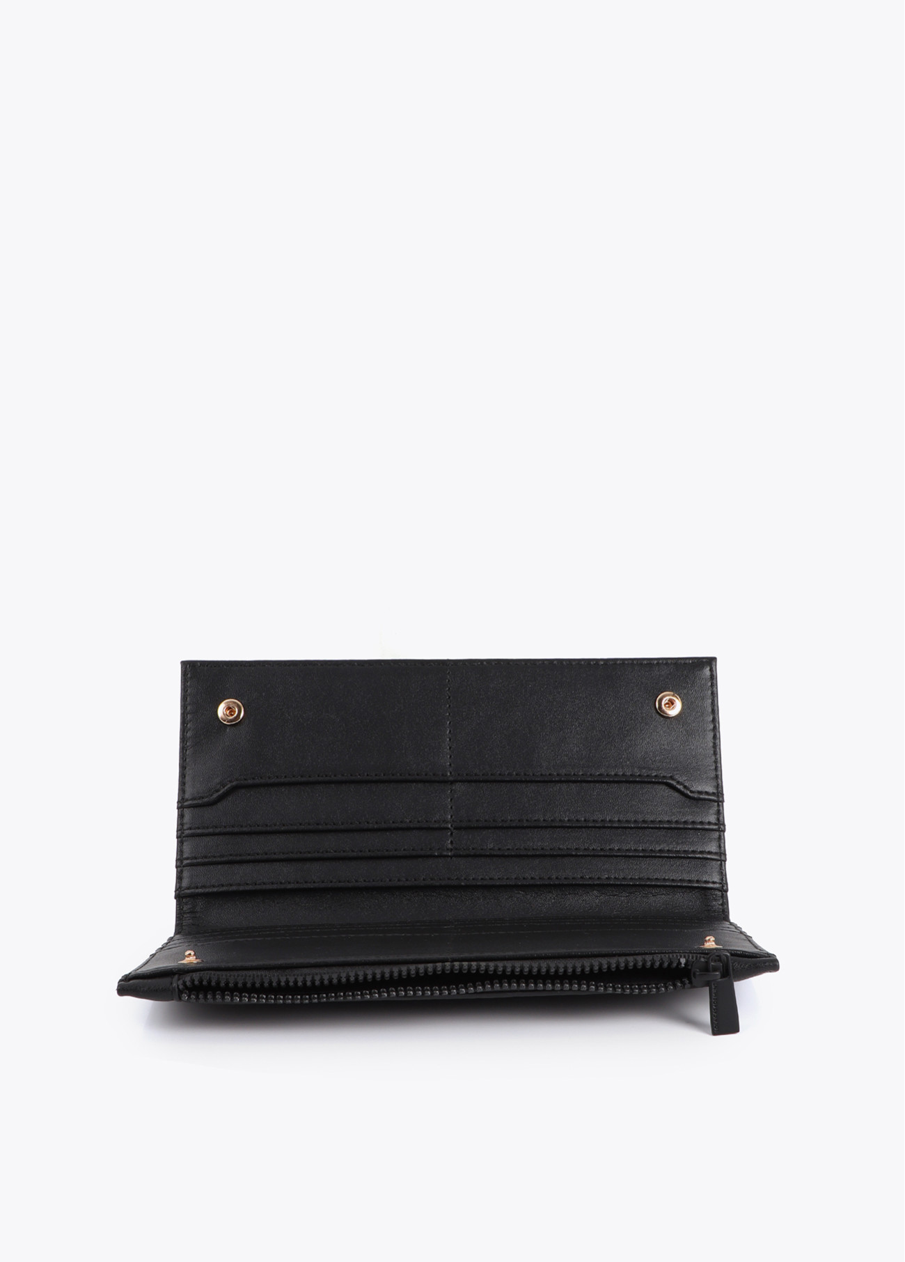 Elegant synthetic material wallet with stitching forming the logo. Internal card compartments and zip closure. A sophisticated accessory with a black finish, ideal for those seeking functionality and elegance.