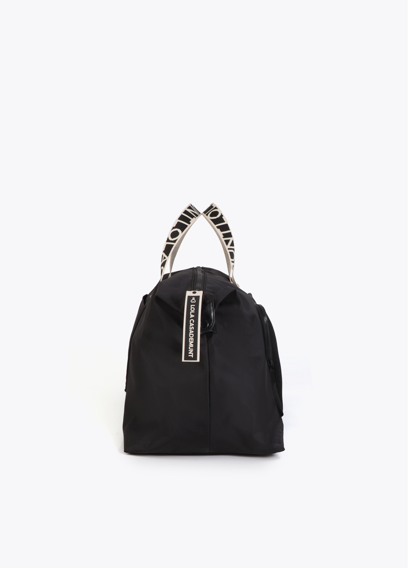 Spacious travel bag made of high-strength black nylon. Features an adjustable strap with logo and multiple compartments for optimal organization. Ideal for weekend getaways, combining style and functionality.