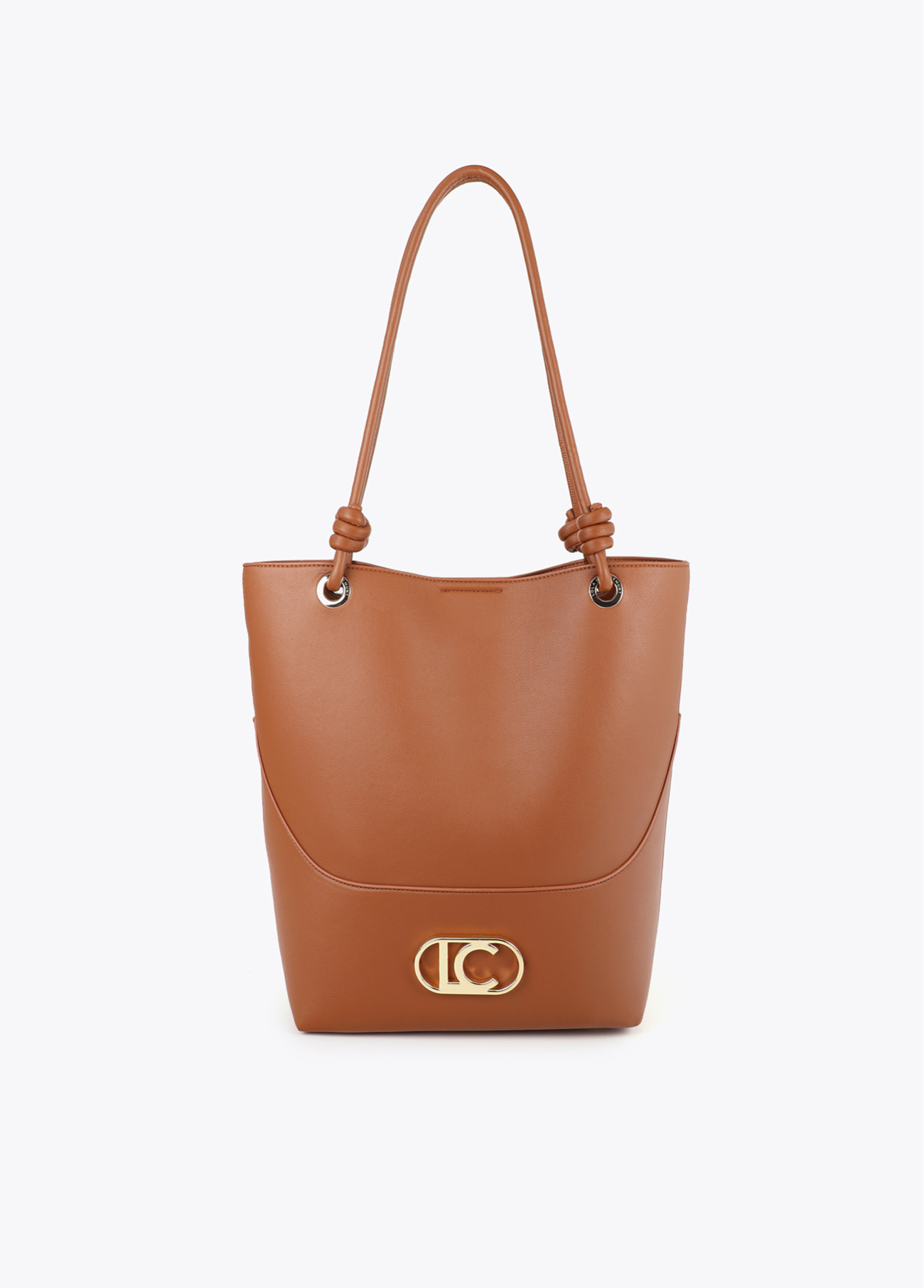 Stylish shopper bag with adjustable top handles. Minimalist design in brown faux leather with gold metallic detail at the base. Spacious interior with secure closure. Ideal for daily use.