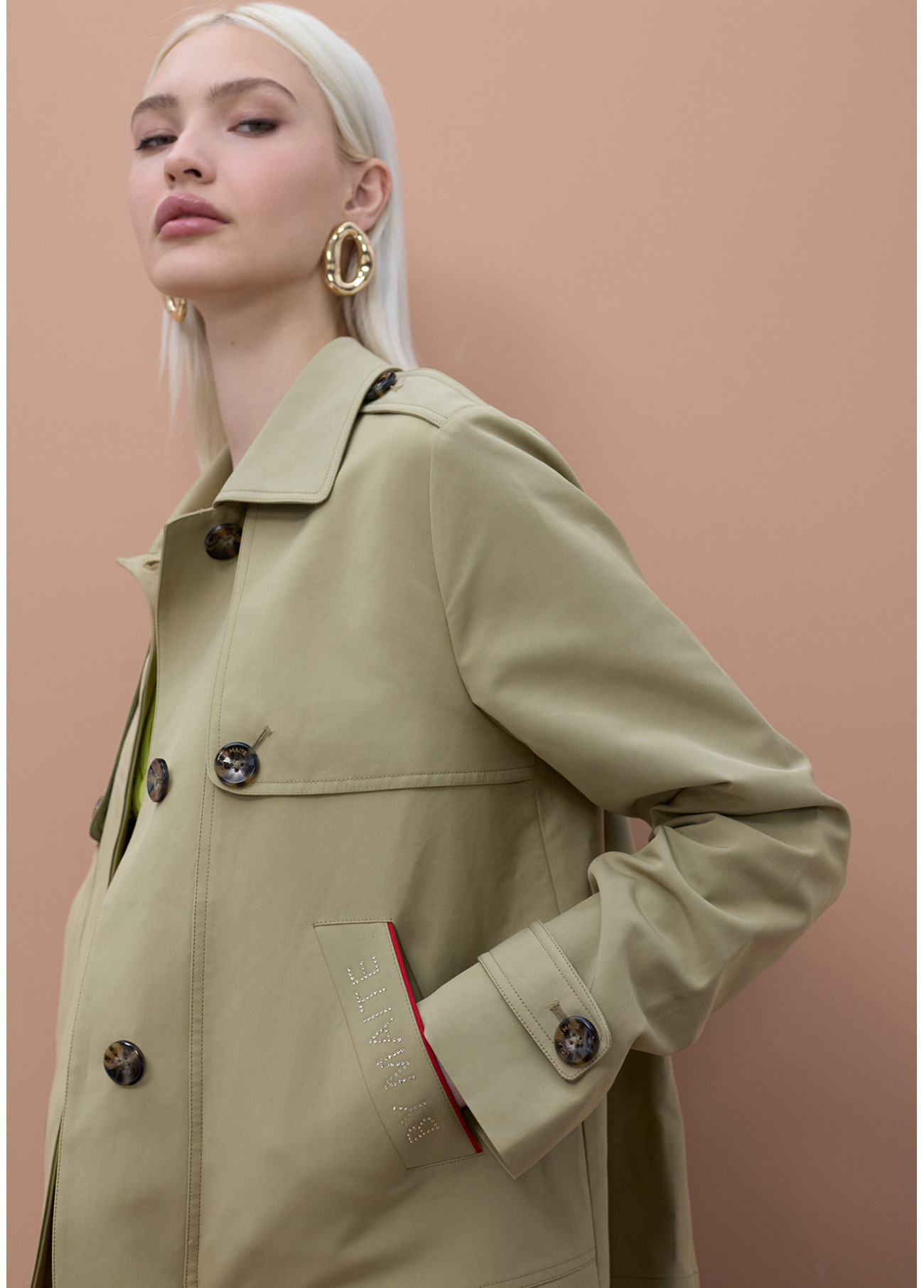 Versatile khaki jacket with button closure. Features a tailored collar, front pockets, and metallic logo detail. Perfect for transitional weather.