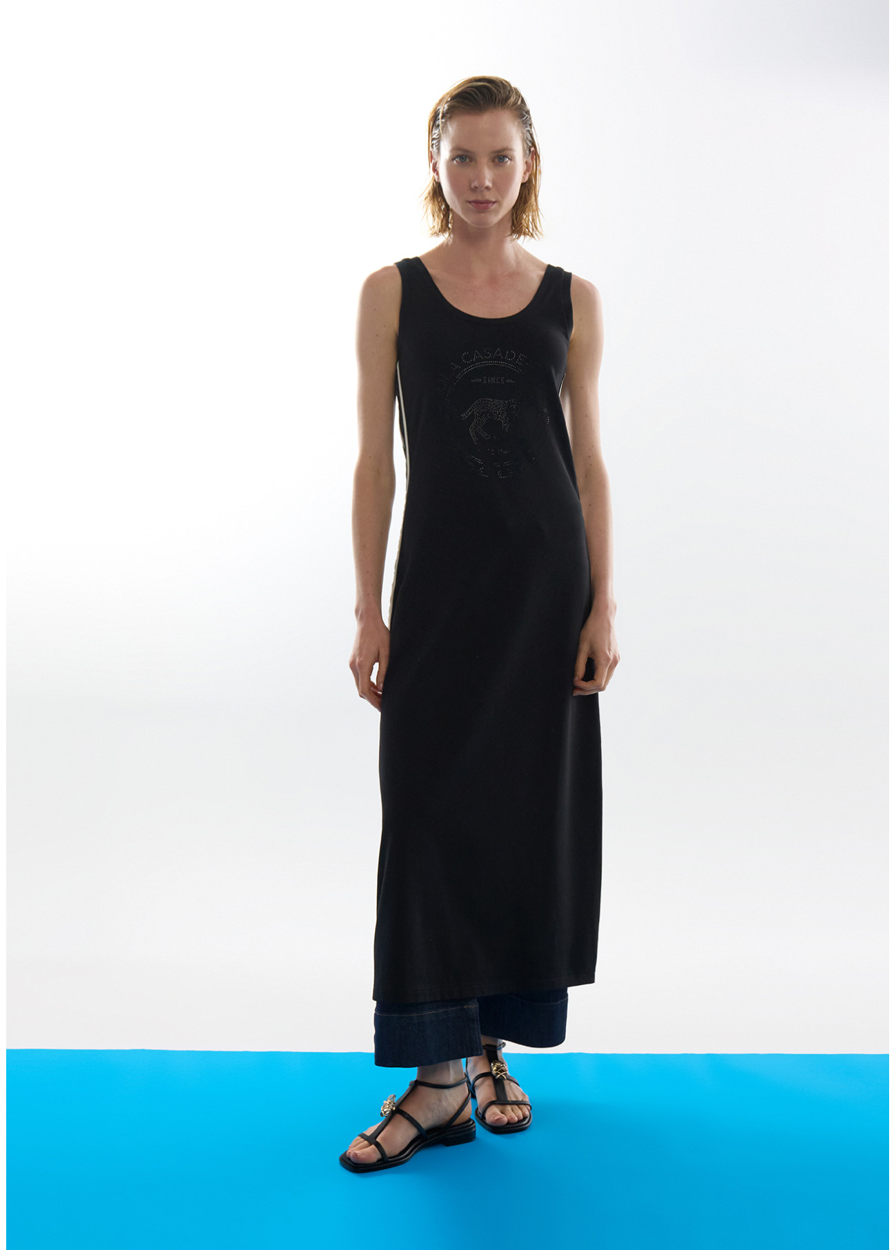 Long, fitted black dress with side stripes for a slimming effect. Designed for comfort and casual style. Lightweight fabric ideal for movement and warm days.