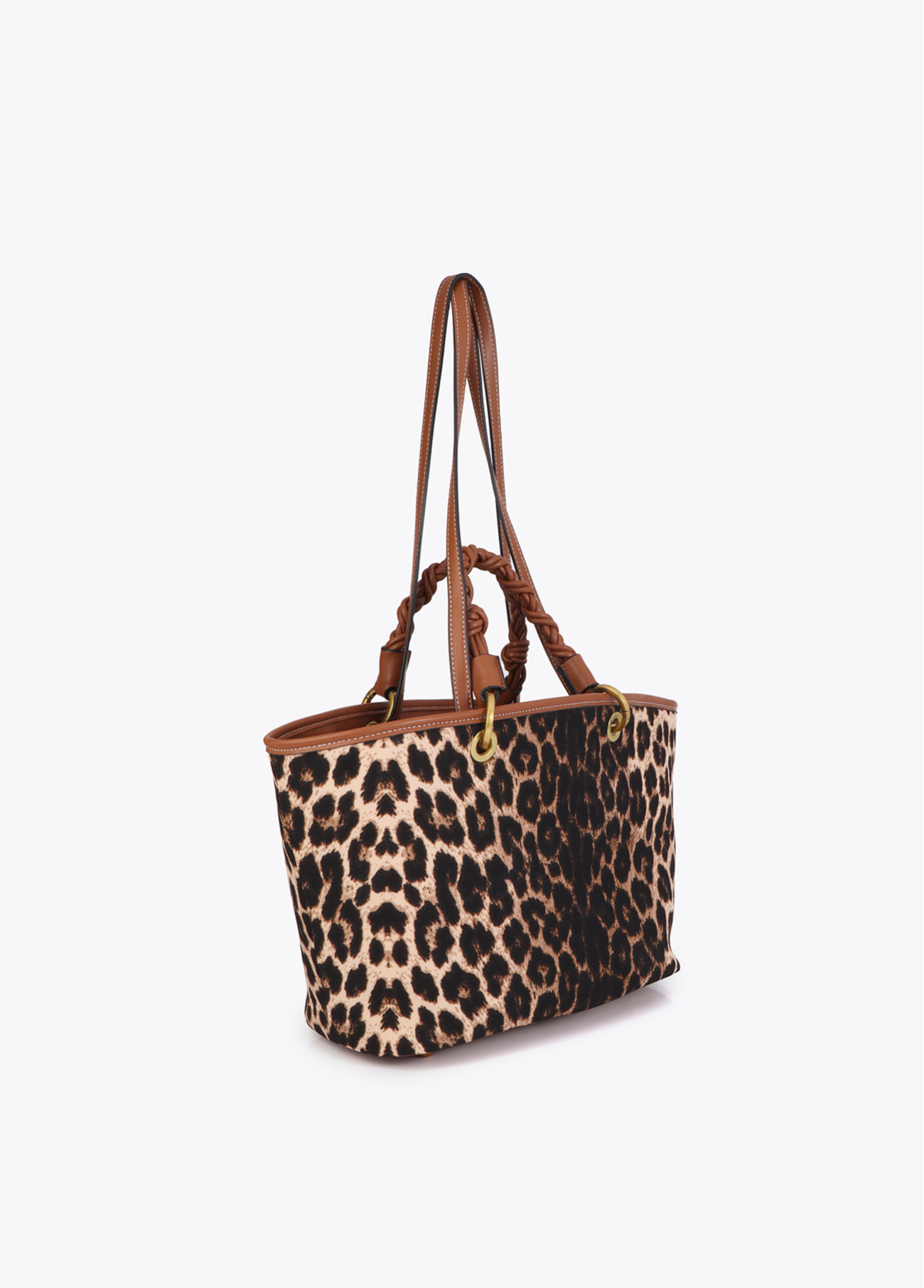 This elegant shopper combines a striking leopard print with brown faux leather details. Features braided handles and magnetic closure. Front pocket with Lola Casademunt's logo in gold. Perfect for a sophisticated urban look.