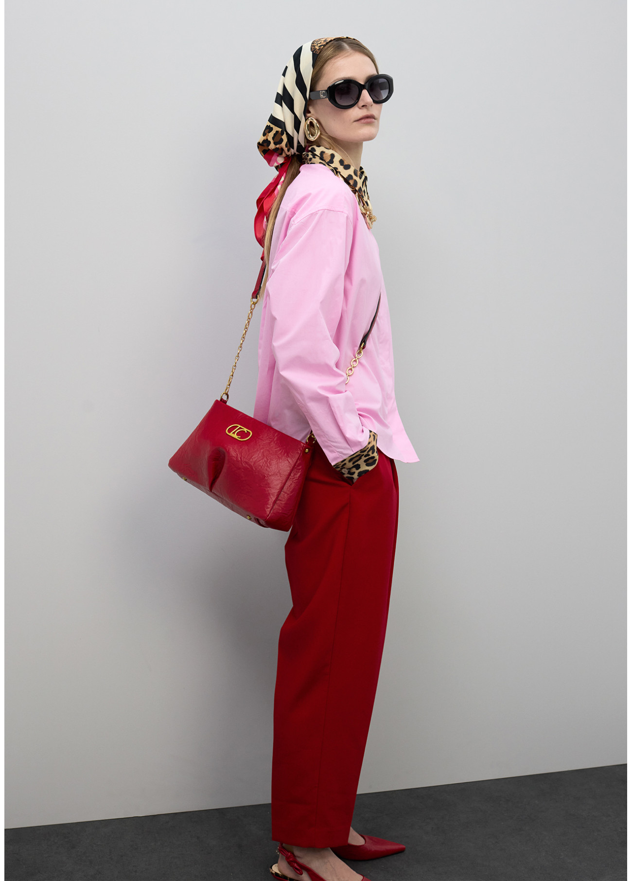 Small crossbody bag in vibrant red. Made from textured material with a zipper closure. Features a gold chain and metal logo on the front. Compact yet spacious design, perfect for essentials.