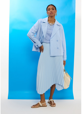 Contemporary style crossover jacket in soft blue washed fabric. Elegant design with button closure, wide collar, and adjustable long sleeves. Perfect for adding a sophisticated touch to any daily outfit.