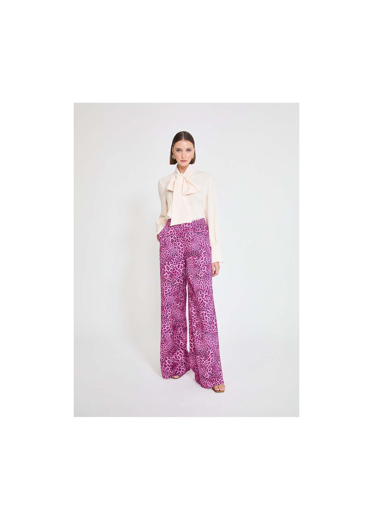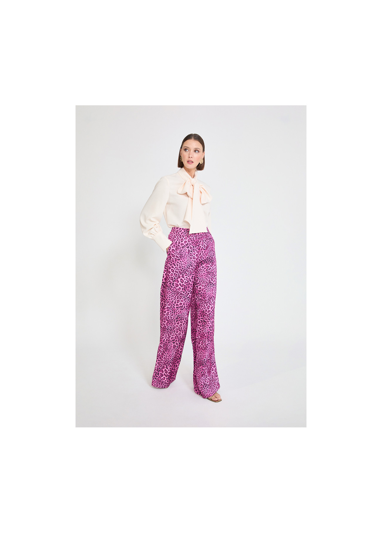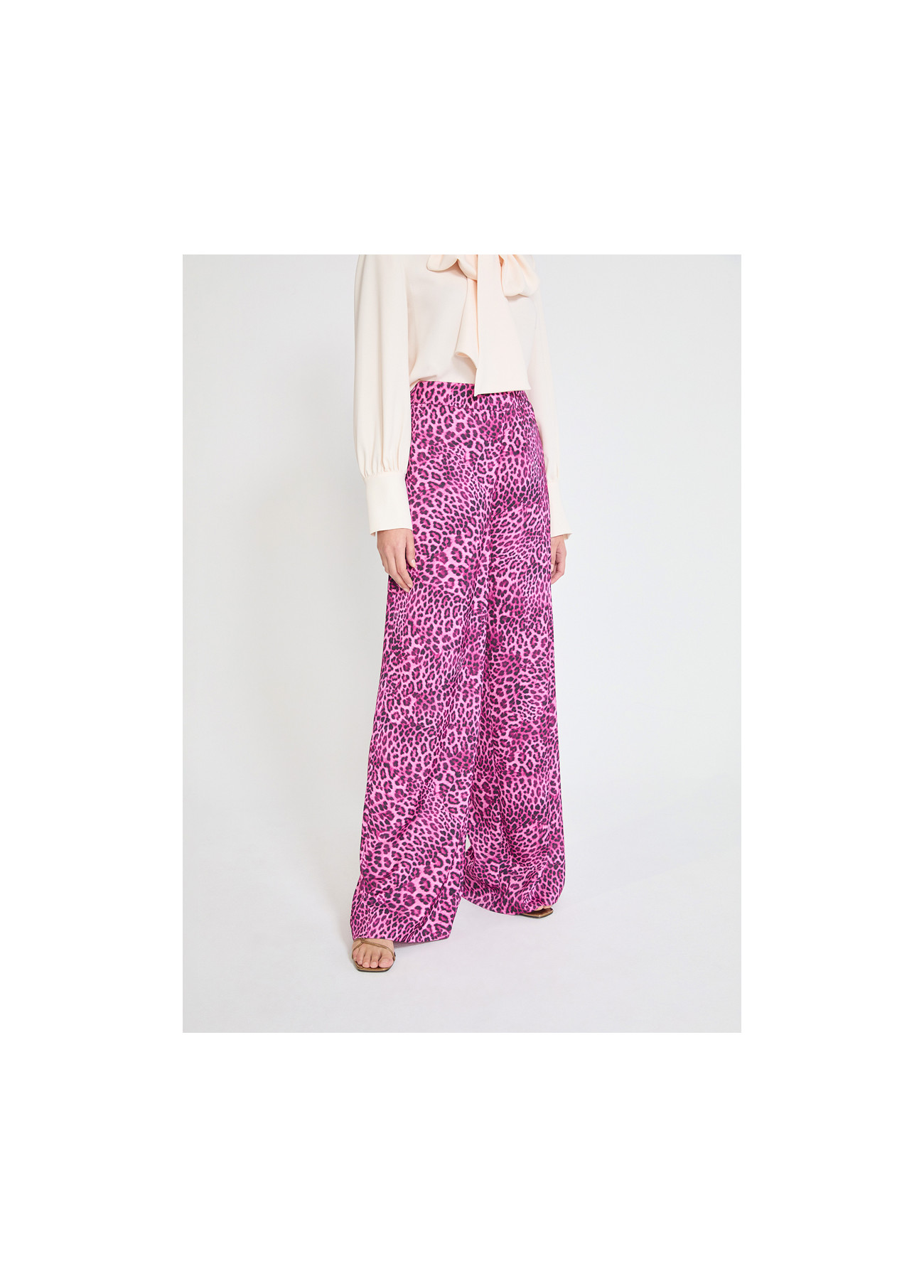 Wideleg pants featuring a striking animal print in buganvilla tones. Crafted from light, fluid fabric, ideal for a modern and bold look. High waist with side invisible zipper closure.