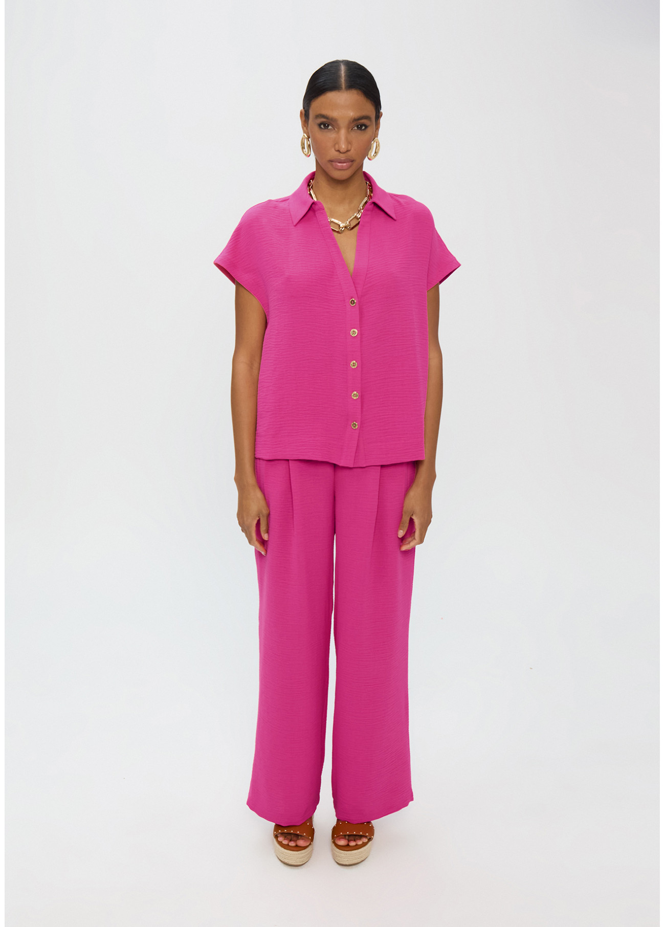 Straight trousers made from fluid crinkle fabric. Vibrant fuchsia color for freshness and style. Elastic waistband for comfort. Perfect to pair with elegant or casual tops as needed.