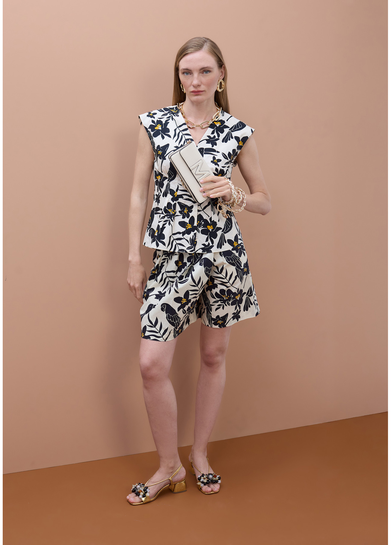 Bermuda crafted from poplin with vibrant tropical print. High-waisted design with a wide cut for a comfortable fit. Ideal for warm climates with its lightweight and breathable fabric. Functional pockets and front button closure.