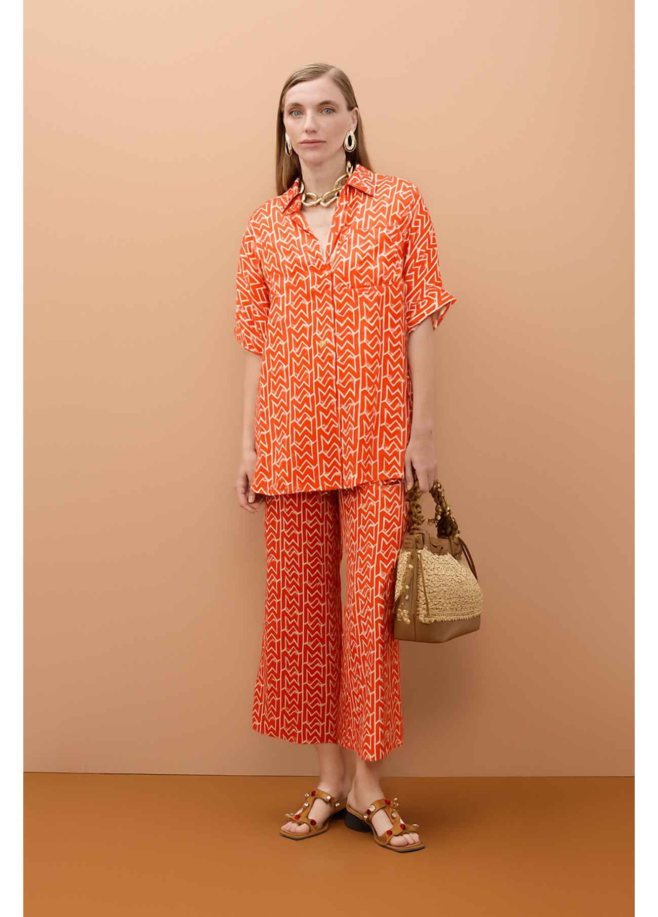 Flowy satin culotte with a vibrant geometric print. High-waisted design and comfortable fit. Perfect for adding a splash of color and style. Pairs well with the matching blouse or neutral garments for a distinguished look.