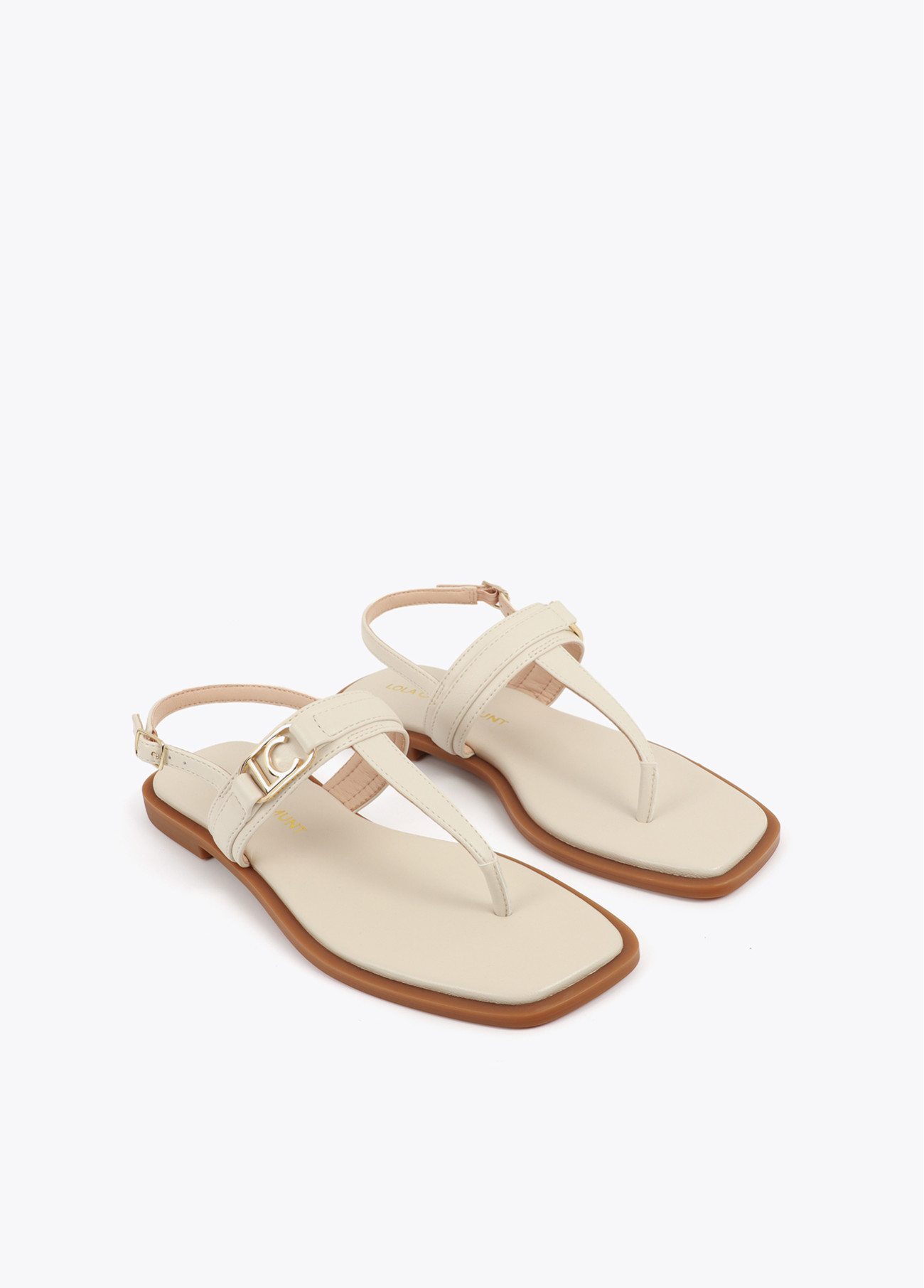 Flat sandal with toe strap made of soft materials. Features an elegant logo buckle on the vamp and non-slip sole for added safety and comfort. Available in a neutral color, ideal for pairing with any casual summer outfit.