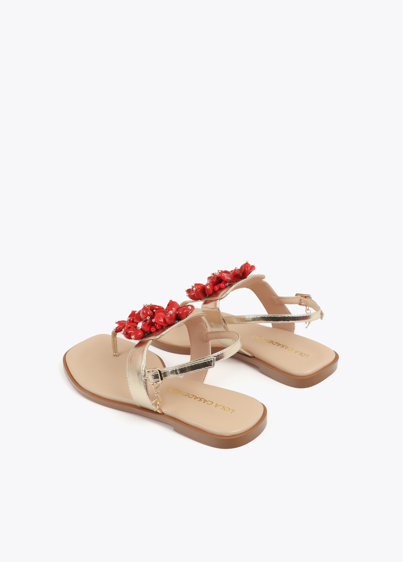 Metallic flat sandal featuring a delicate raised flower design. Adjustable closure and comfortable sole. A piece that adds sophistication to your summer look.