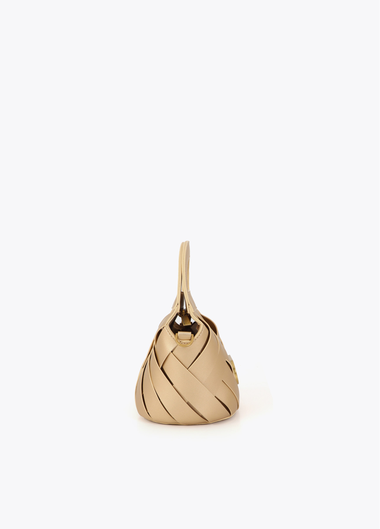 Elegant woven handbag in a refined gold finish. Designed with a hand handle and adjustable strap for versatility. Distinctive logo detail on the front. Spacious interior with zip closure.