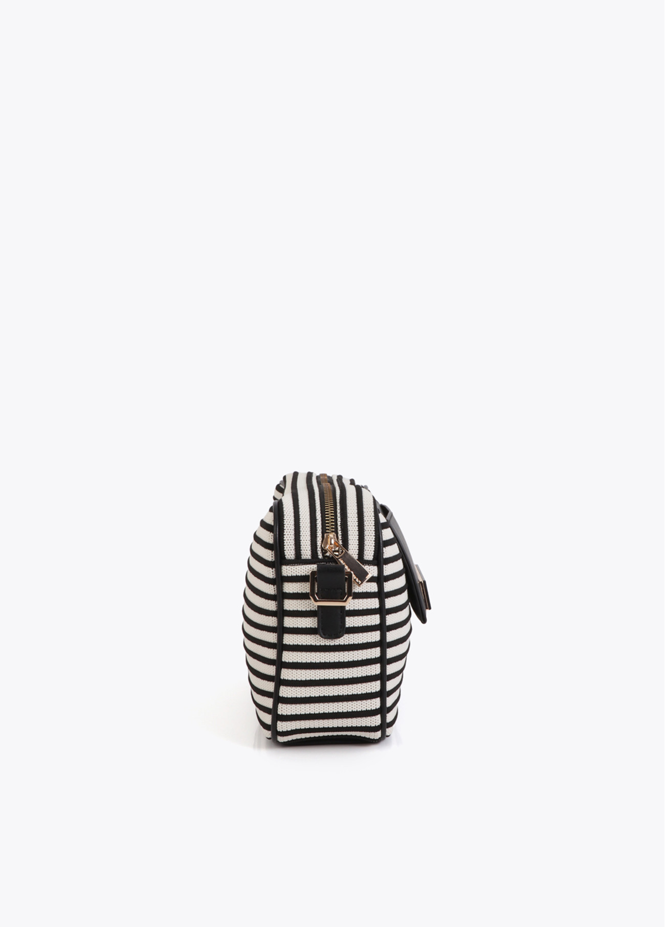 Striped crossbody bag with leather effect details. Gold zip closure and adjustable strap. Features a logo plaque on the front, blending style with functionality for everyday use.