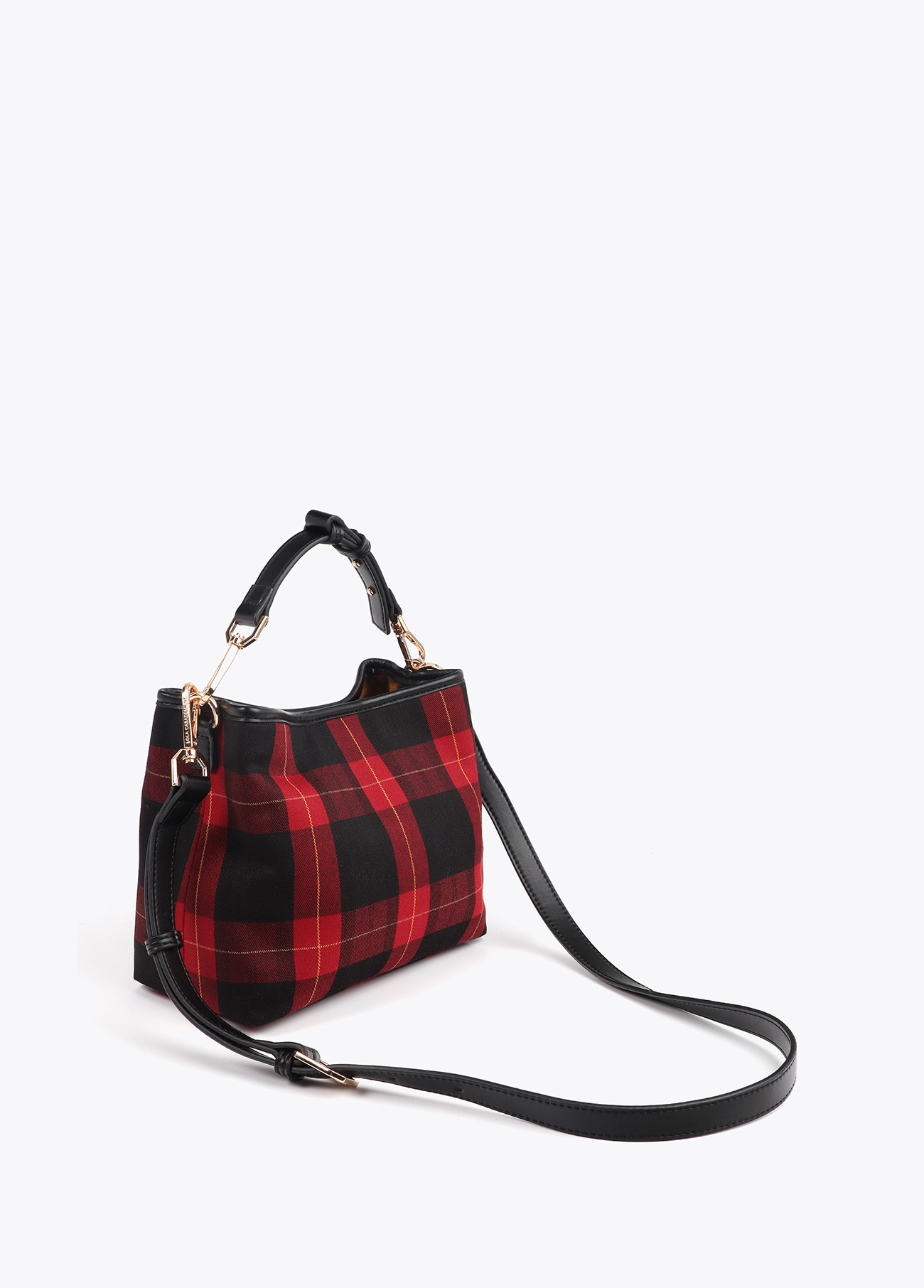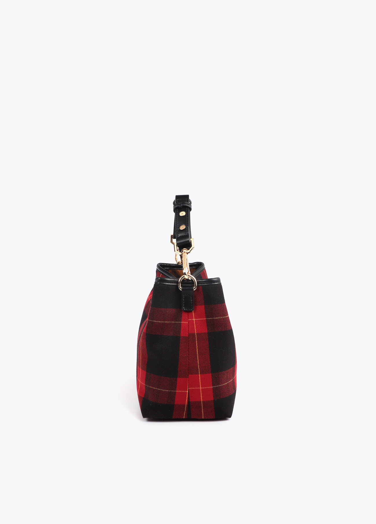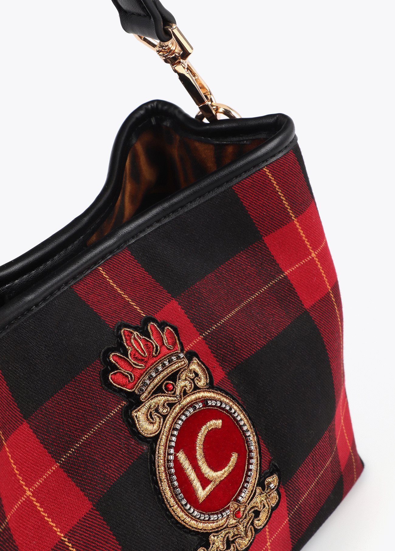 Fabric pouch with plaid design, adorned with an elegant crest patch. Adjustable strap and top zipper closure. Lined interior with practical pockets.