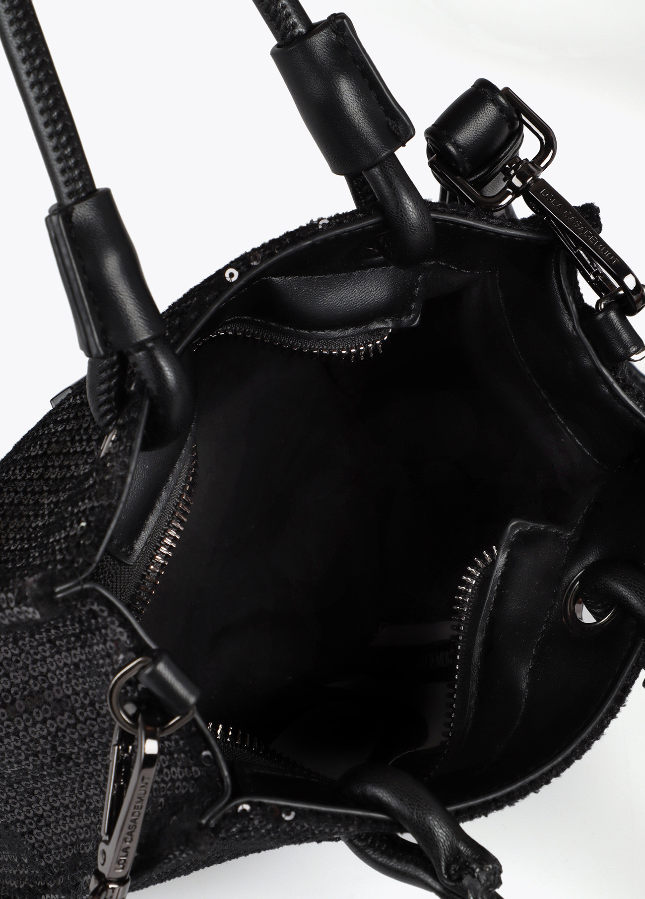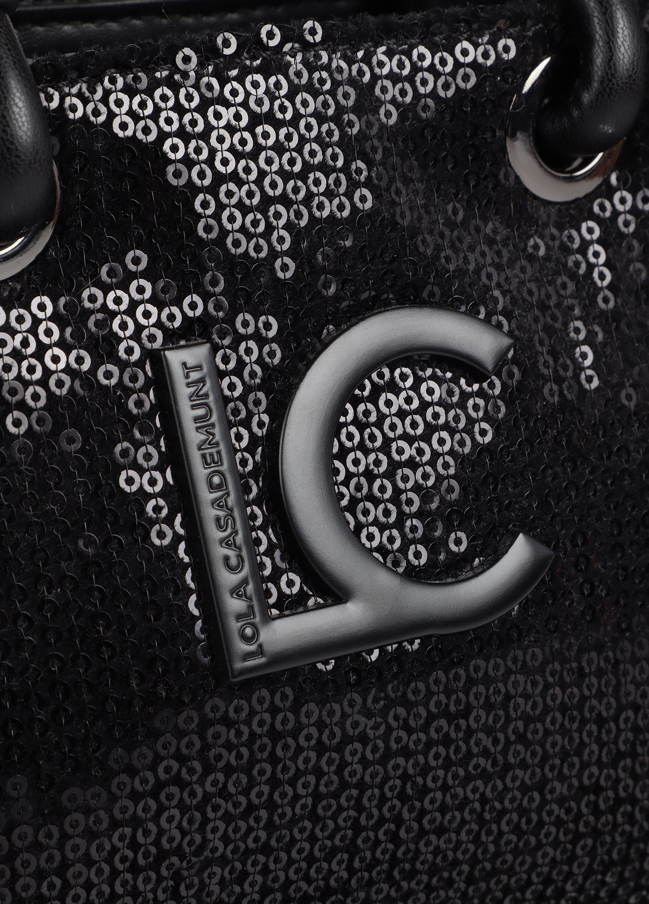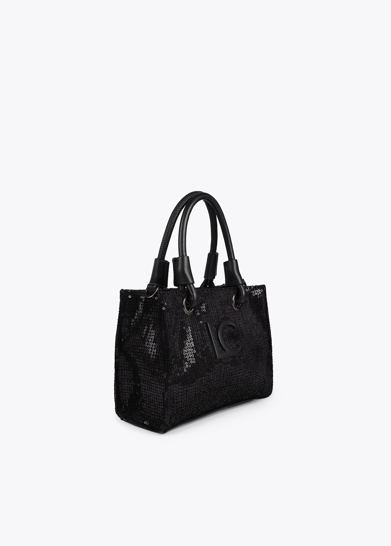 Elegant mini shopper with shiny sequins and tone-on-tone logo. Reinforced double handle and secure closure. Spacious interior with practical pockets. Perfect to shine.