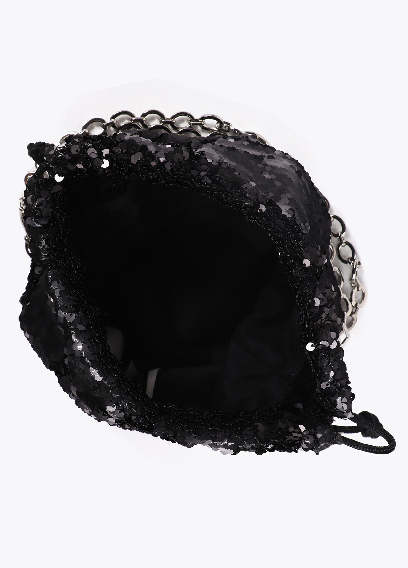 Exquisite bucket bag covered with matte sequins. Features a metal chain and adjustable drawstring closure. Perfect for adding a chic touch to your style.