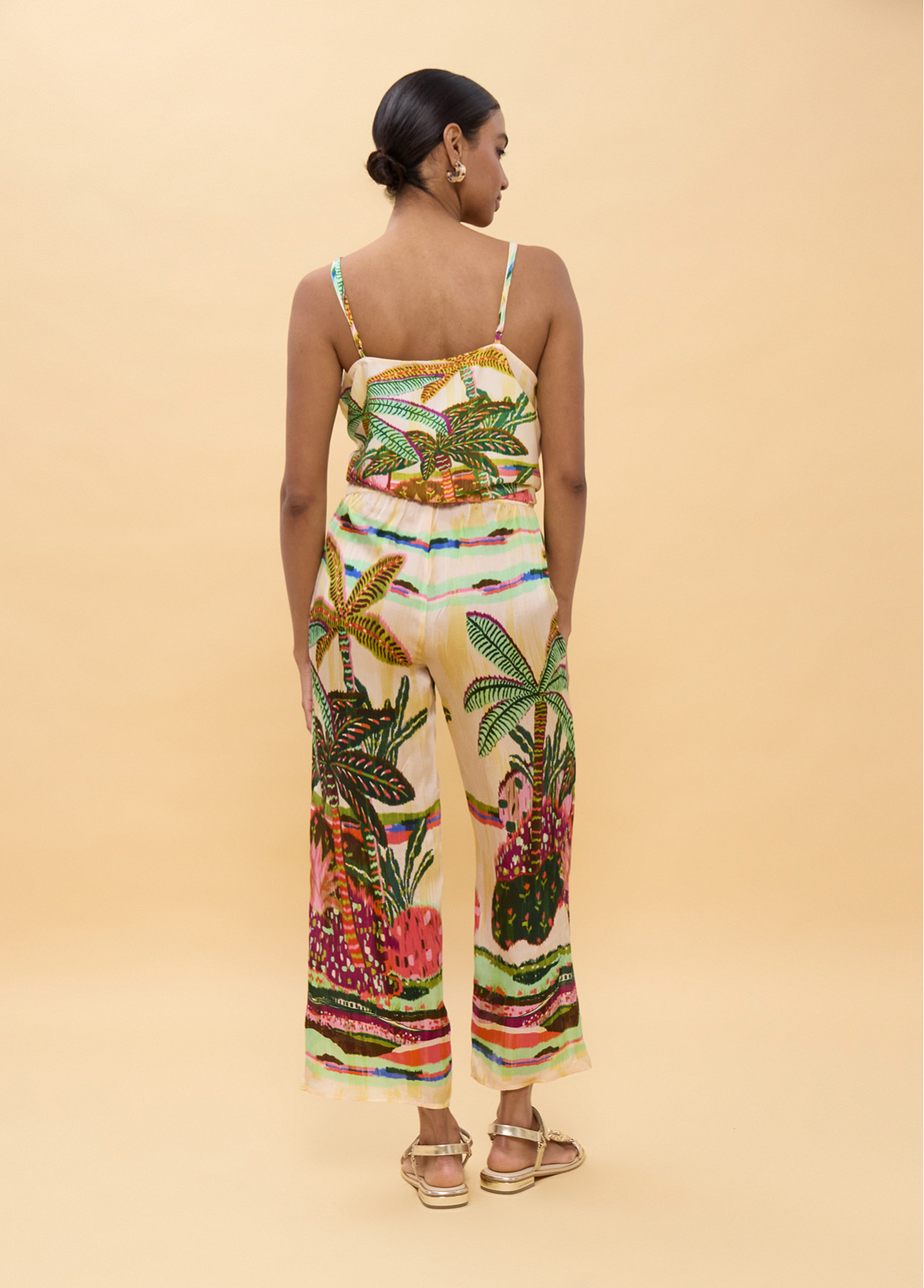 Lingerie top with thin straps in multicolor palm print. Designed in a light, airy fabric that ensures freshness and comfort. Perfect for pairing with pants or skirts, adding a tropical, vibrant touch to any look.