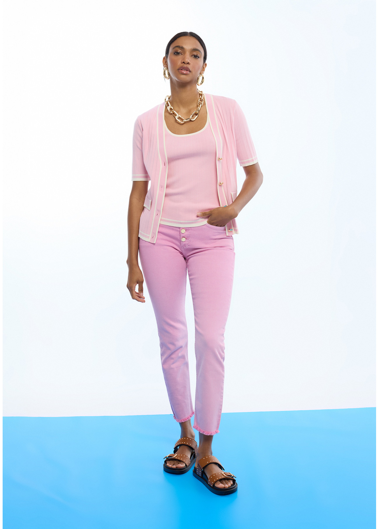 Delicate sleeveless top in pink with contrast pleated ribbing. Made from elastic fabric for a flattering fit. Perfect for both casual and formal looks with a blazer.