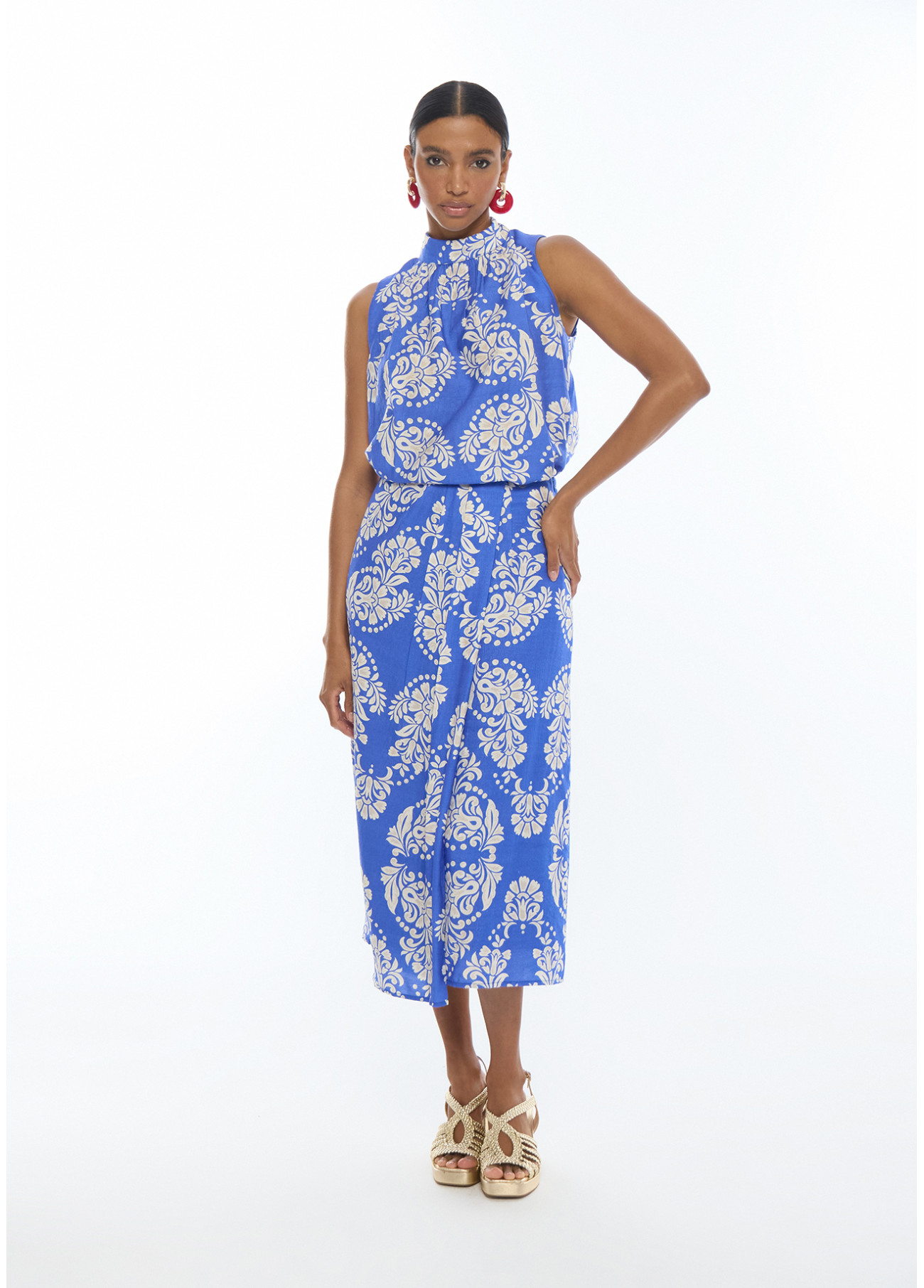 Sleeveless top with a high neck and sophisticated paisley print. Flowing design that flatters the silhouette, crafted from soft, lightweight fabric. Perfect for pairing with pants or skirts for a chic and modern look.