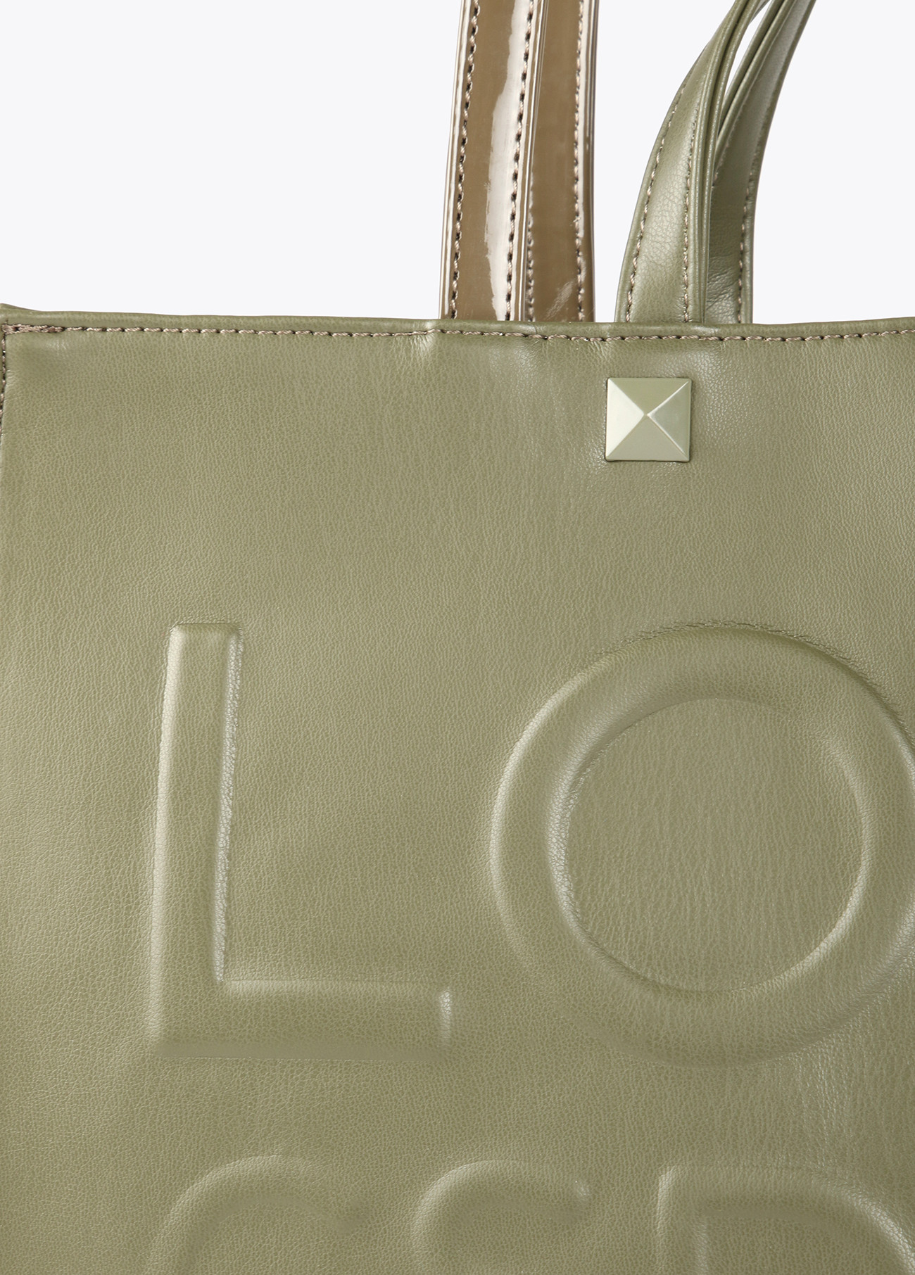 Shopper bag with embossed logo on the front. Features hand straps, crossbody strap, and zip closure. Practical and elegant design, ideal for daily use.