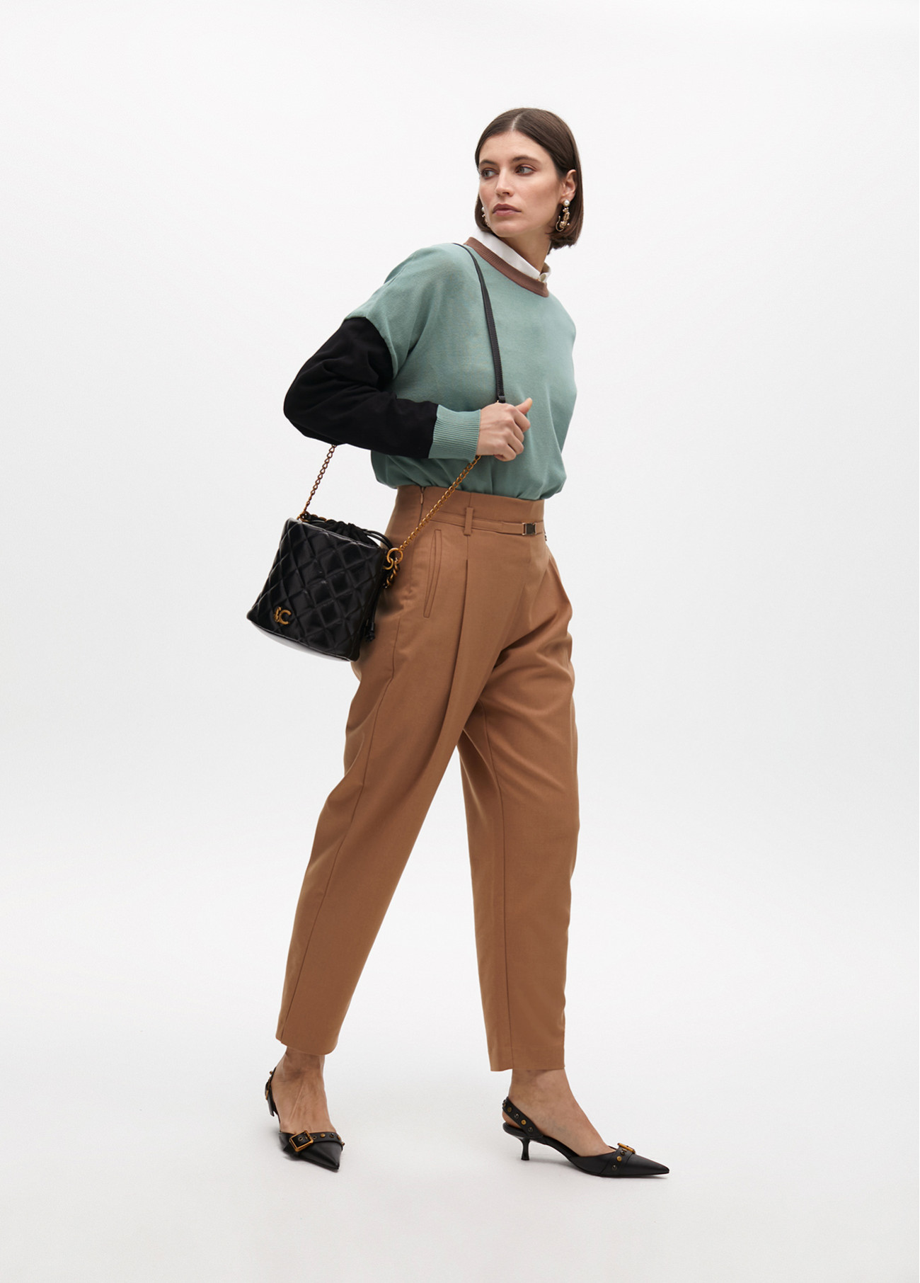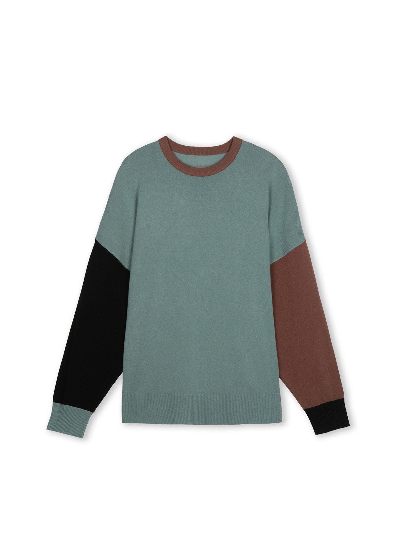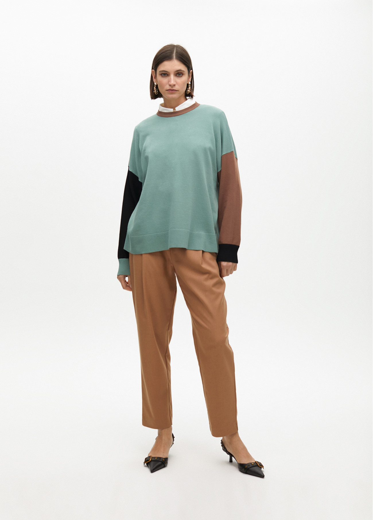 Tricolor design sweater with puff sleeves. Made from high-quality knit, offering a comfortable fit with a modern touch. Perfect for elevating your everyday looks.
