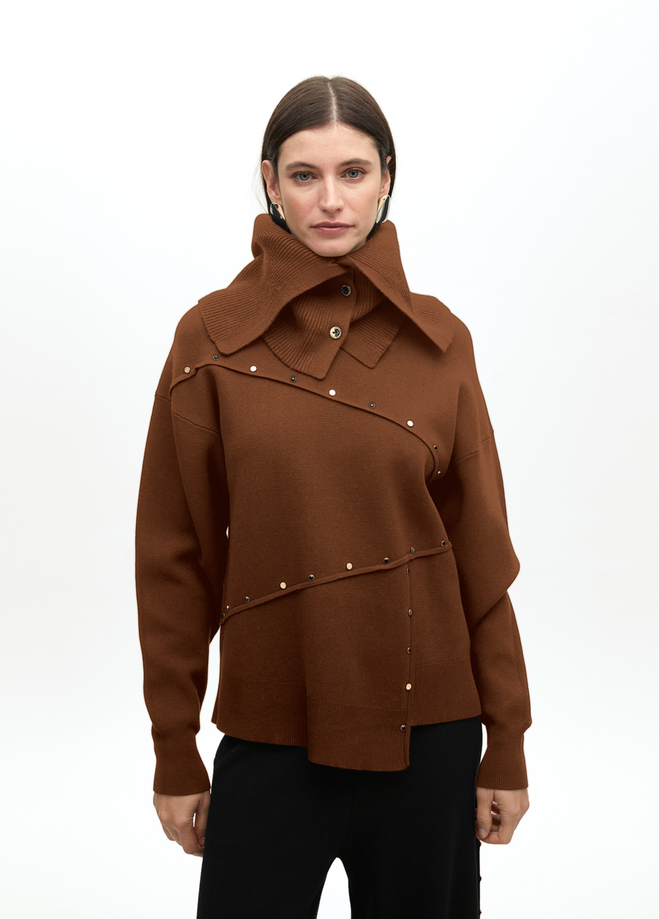 Elegant deconstructed sweater with innovative metal stud design. Made from soft fabric for a comfortable fit. The asymmetrical structure and high collar add a modern touch. Perfect for elevating any daytime or evening outfit.