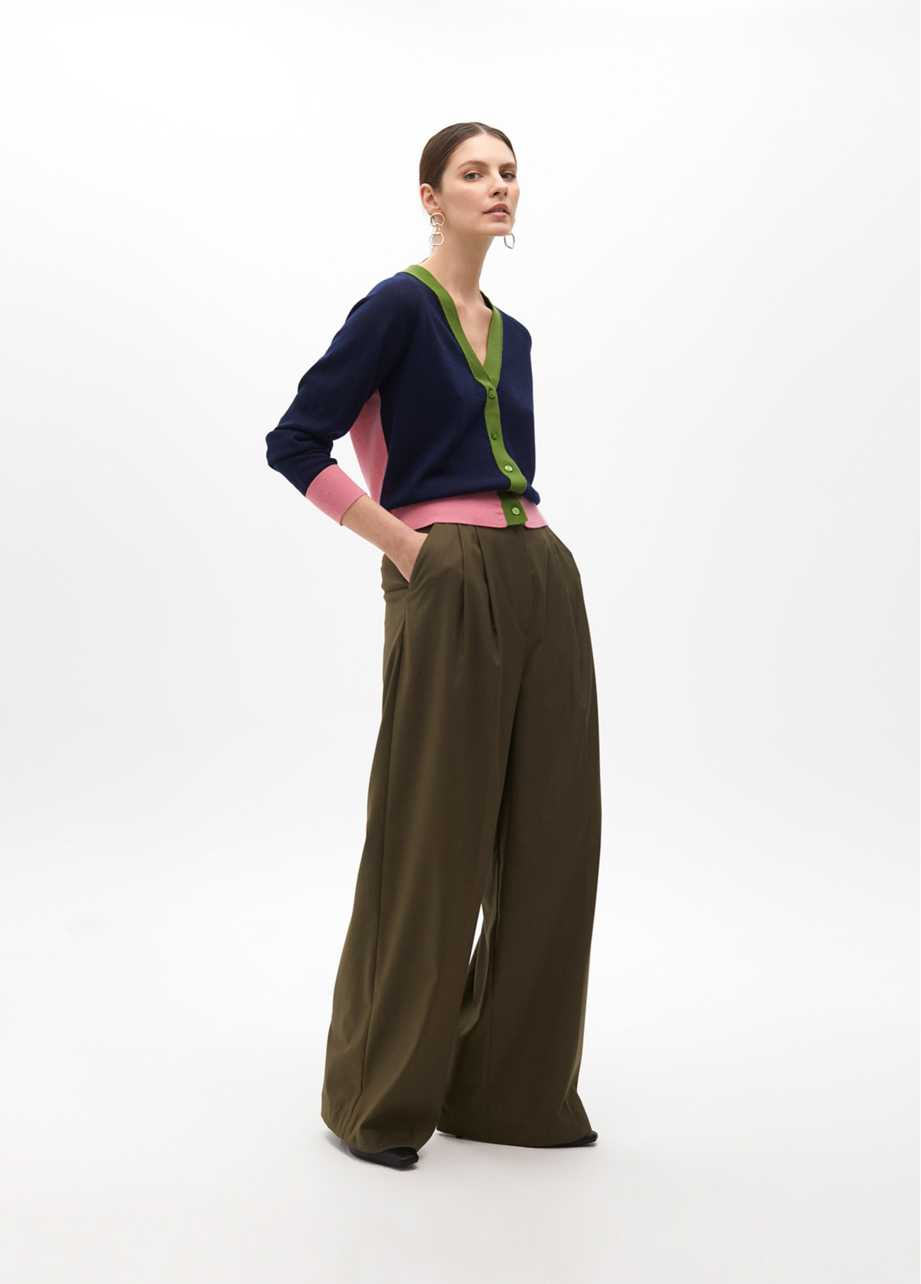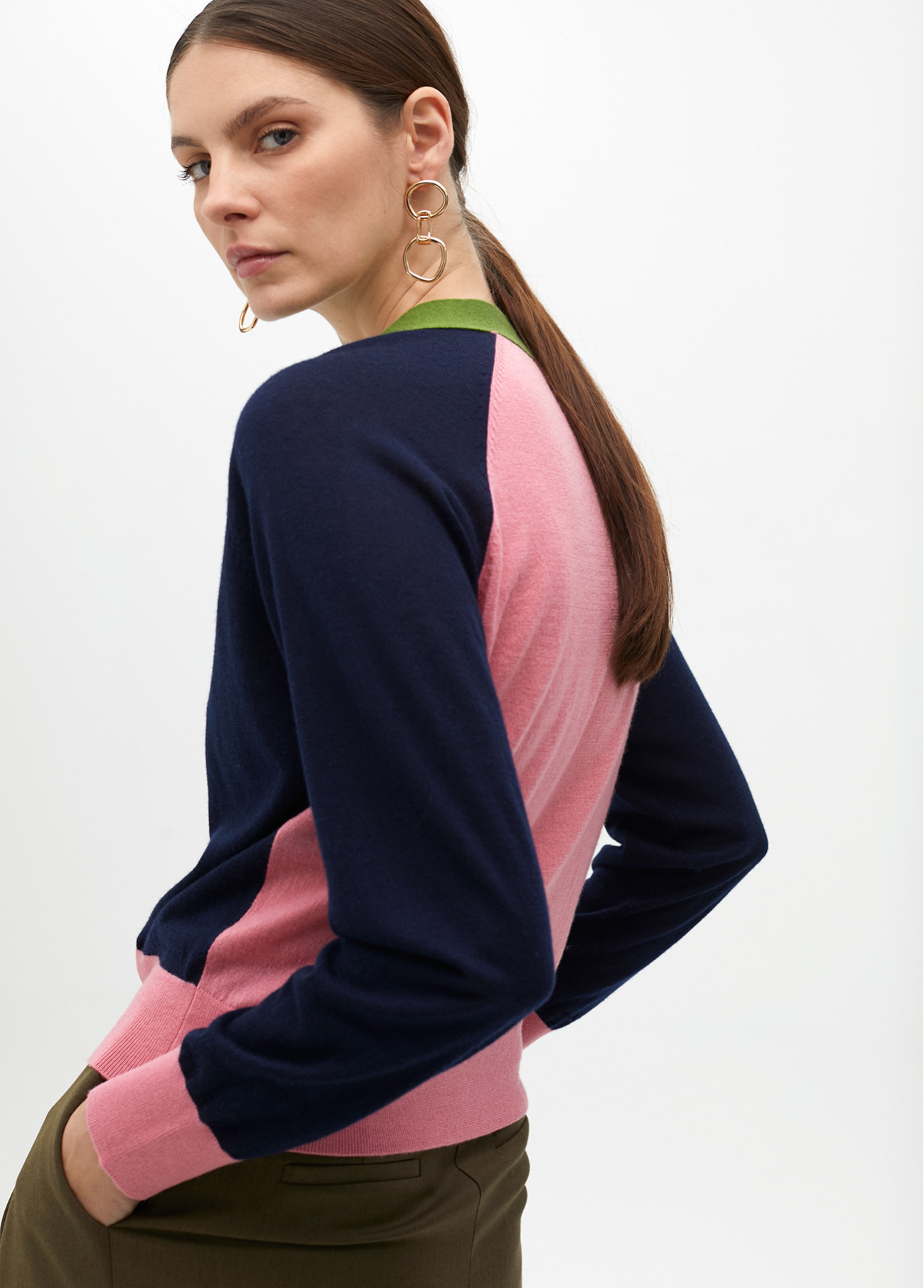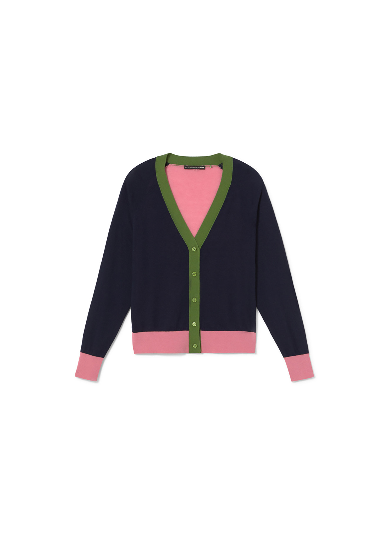 Lightweight knitted cardigan in navy blue, green, and pink. Features a V-neck and button closure. Contrasting cuffs and hem. Perfect for any season.