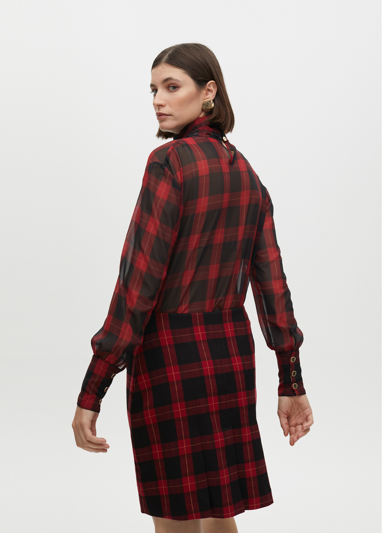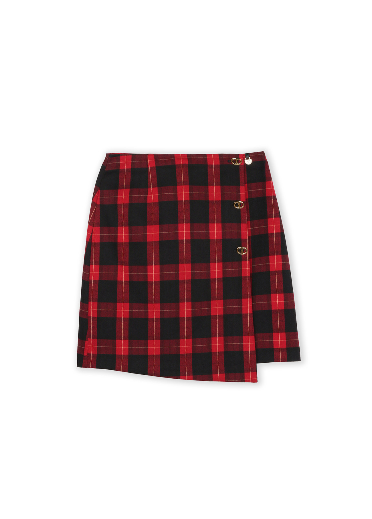 Mini skirt in tartan checks, red and black tones. Made from wool for a warm winter. Side closure with decorative gold buttons. Waistline fit enhances the figure, a seasonal wardrobe essential.
