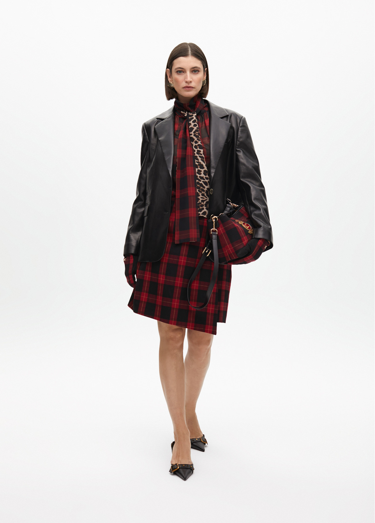 Unique design shirt combining animal print and red tartan pattern. Features a bow tie at the neck, long buttoned sleeves, and sheer details. Perfect for a sophisticated look.