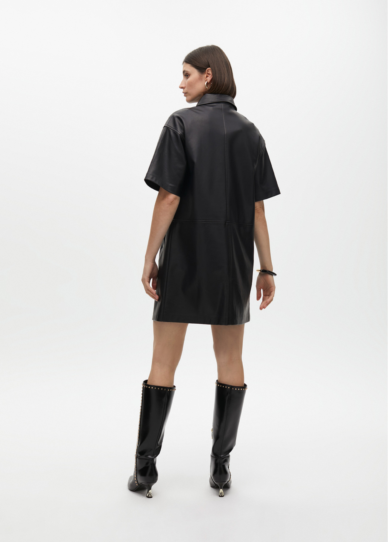 Straight mini dress crafted in synthetic material with a faux leather look. Features gold buttons on the front and an elegant shirt collar. Chest pocket details and short sleeves for a modern and sophisticated style. Perfect for standing out in any outing.