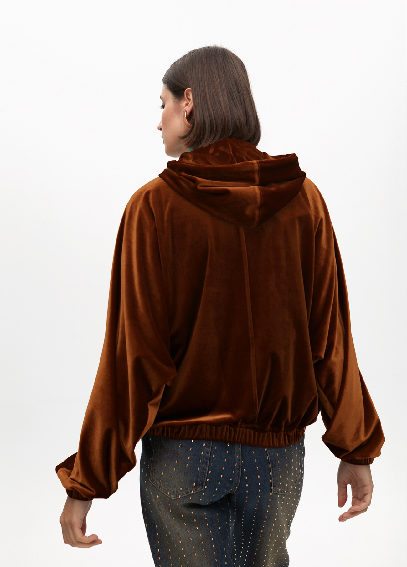 Oversized hoodie crafted from soft velvet. Features adjustable hood and front zipper. Wide sleeves with elastic cuffs. Functional side pockets.