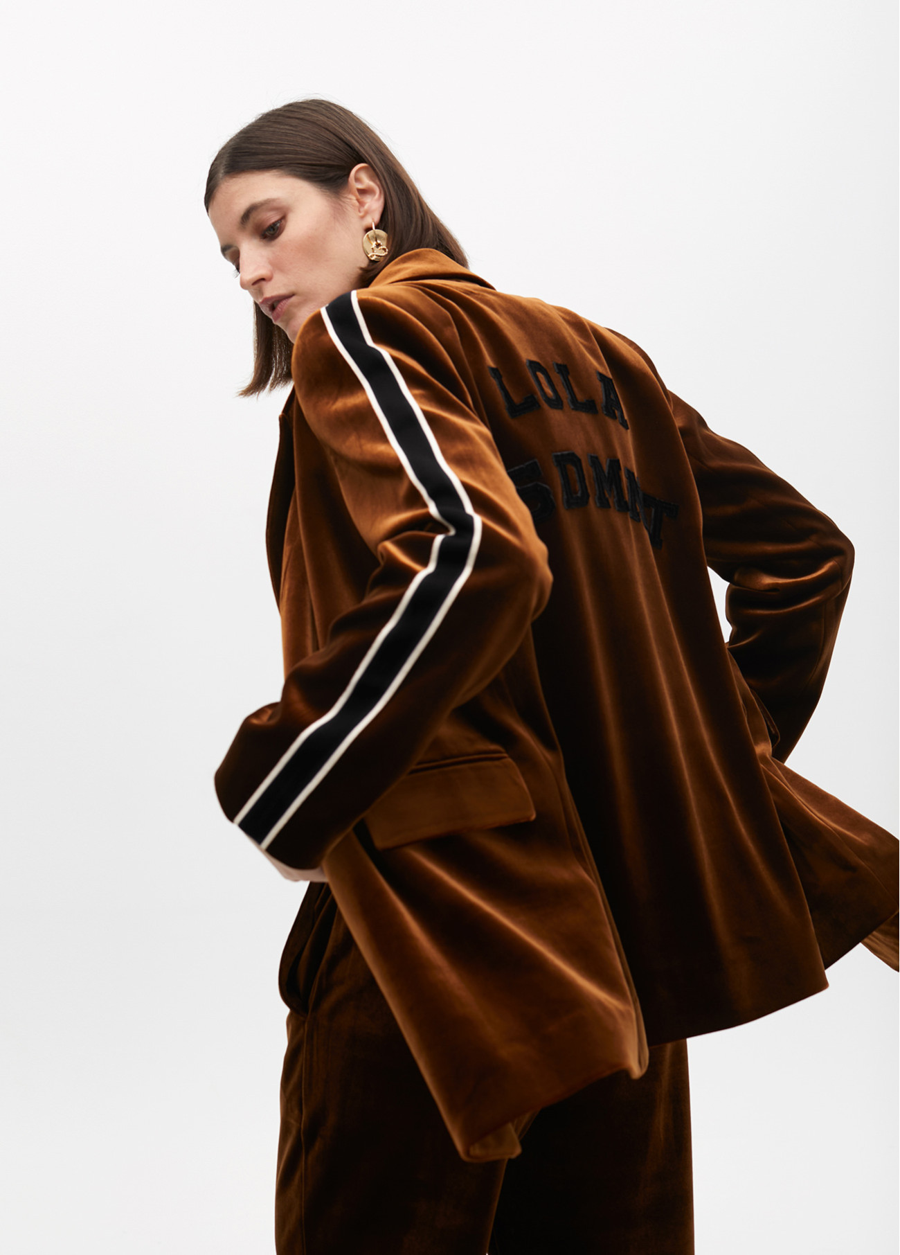 Elegant velvet blazer with stripe detailing on the sleeves. Classic lapel design, button closure, and front pockets. Embroidered logo on the back for a sophisticated finish.