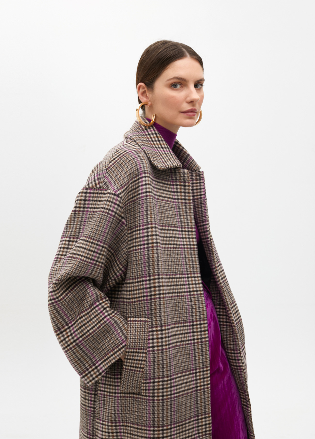 Wool coat with plaid pattern in neutral tones. Oversized design with classic lapel and button closure. Spacious side pockets for convenience. Made with warm materials, ideal for cold days. Plaid pattern adds a touch of elegance and style.