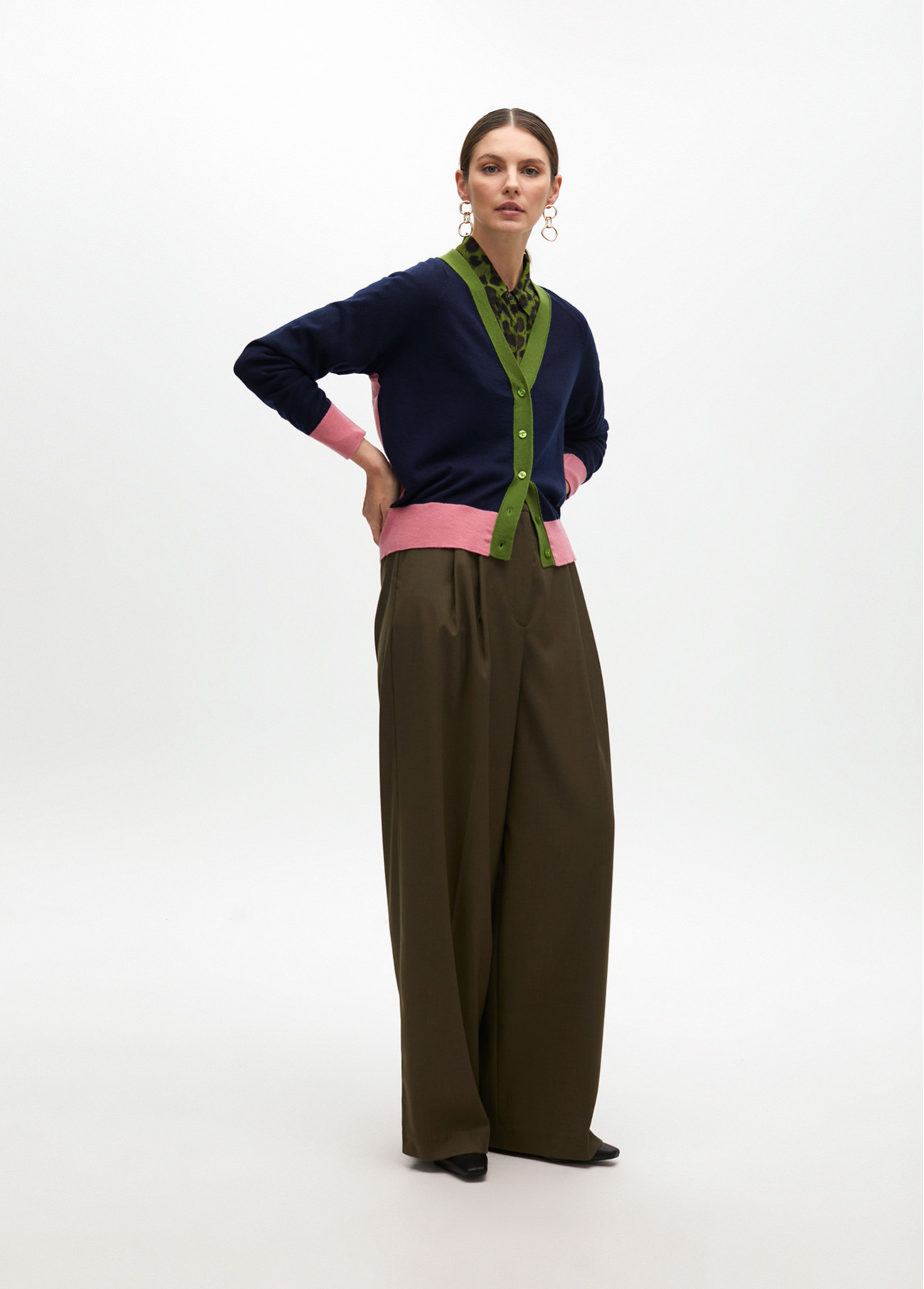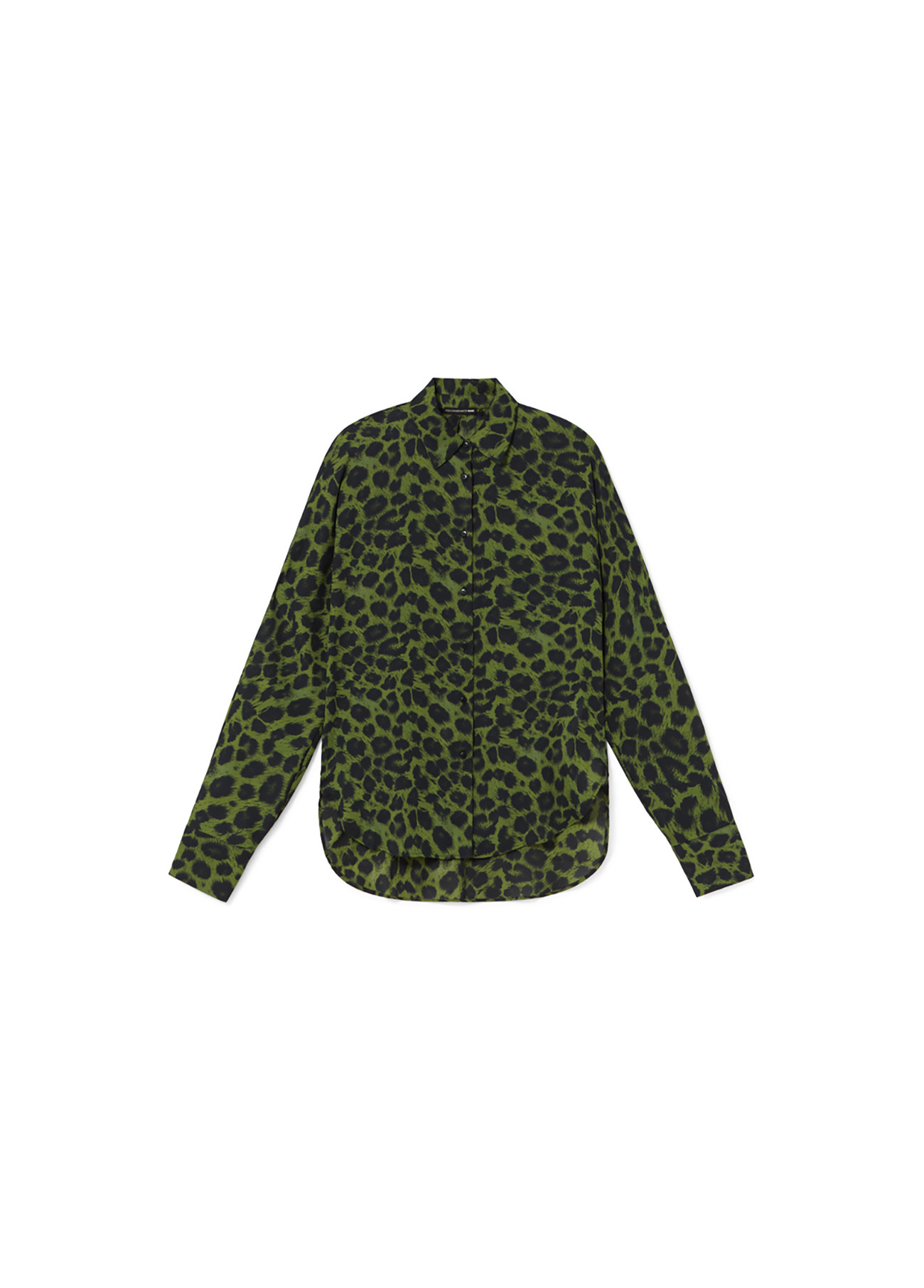 Chiffon shirt with green animal print design. Loose fit with classic collar and front button closure. Long sleeves with adjustable cuffs. Perfect for adding a wild touch to your wardrobe.