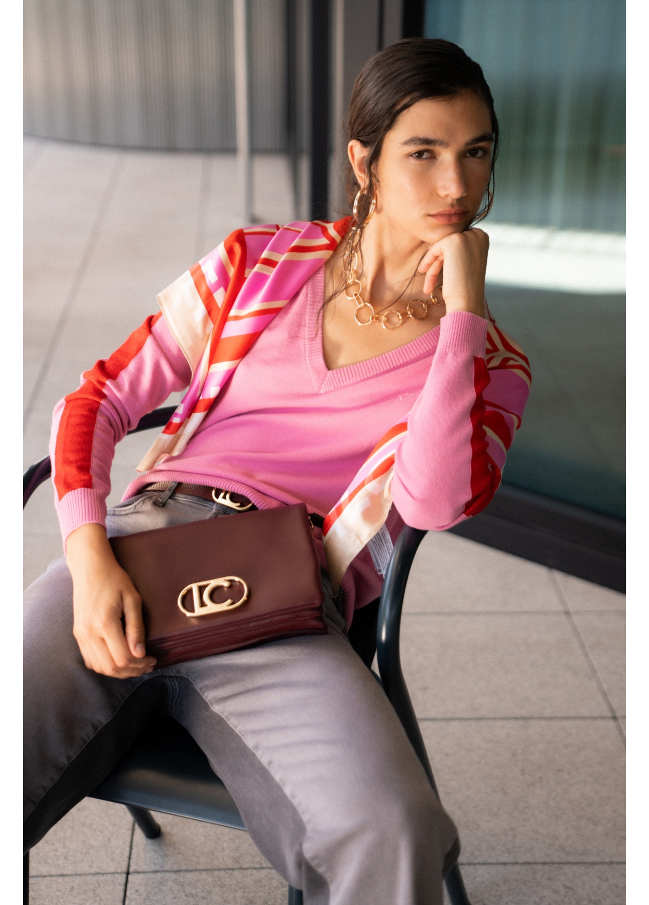 Soft knit sweater with V-neck and contrasting color details on sleeves. Designed in vibrant tones with comfortable fit and ribbed hem. Perfect for a casual, modern look.
