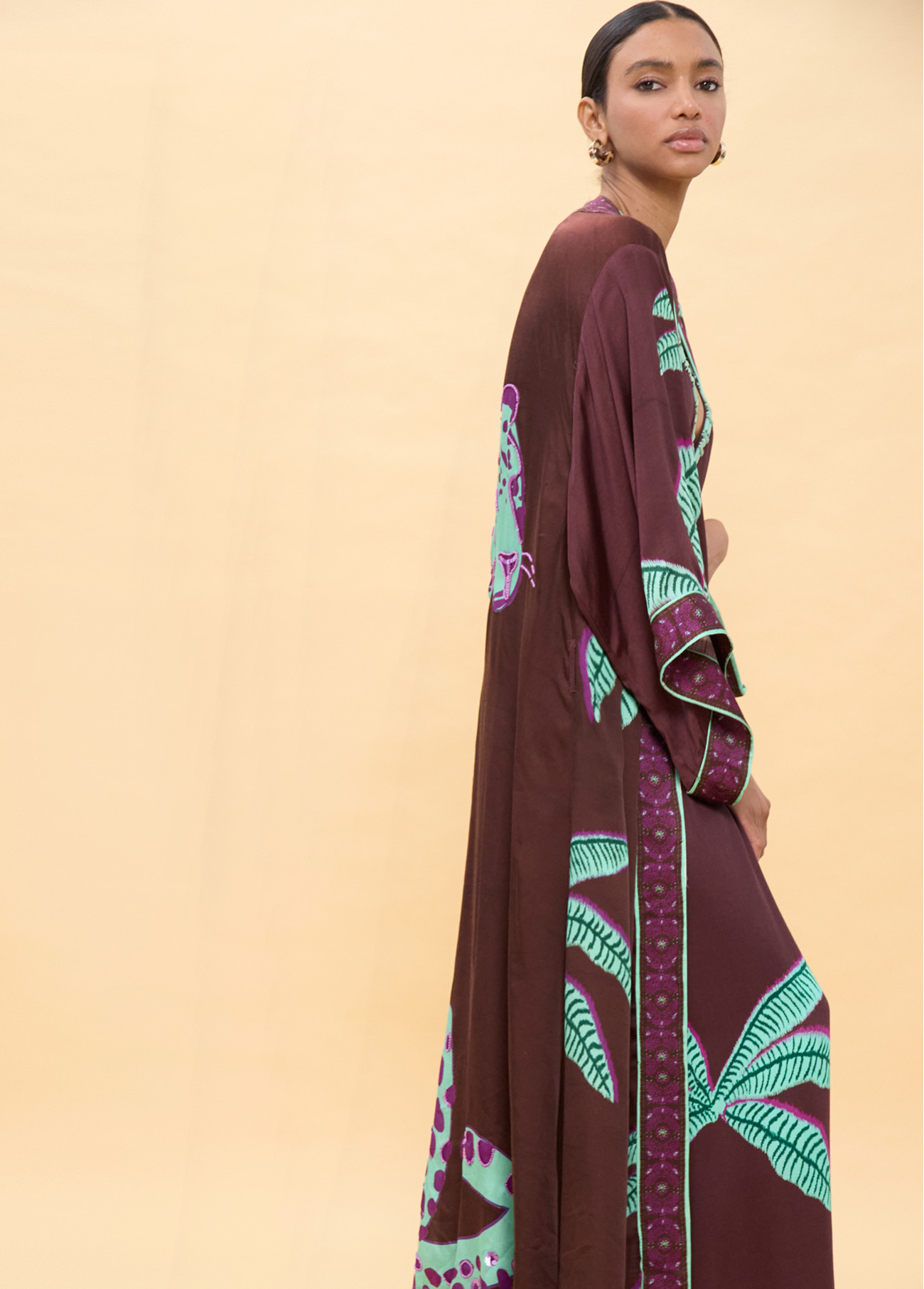Elegant long kimono with palm tree and leopard print in vibrant tones. Designed with lightweight fabric for a sophisticated look. Features wide sleeves and decorative edges.