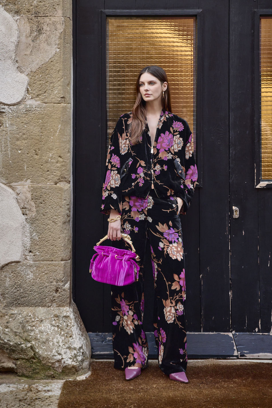Pantalón recto devoré terciopelo estampado floral