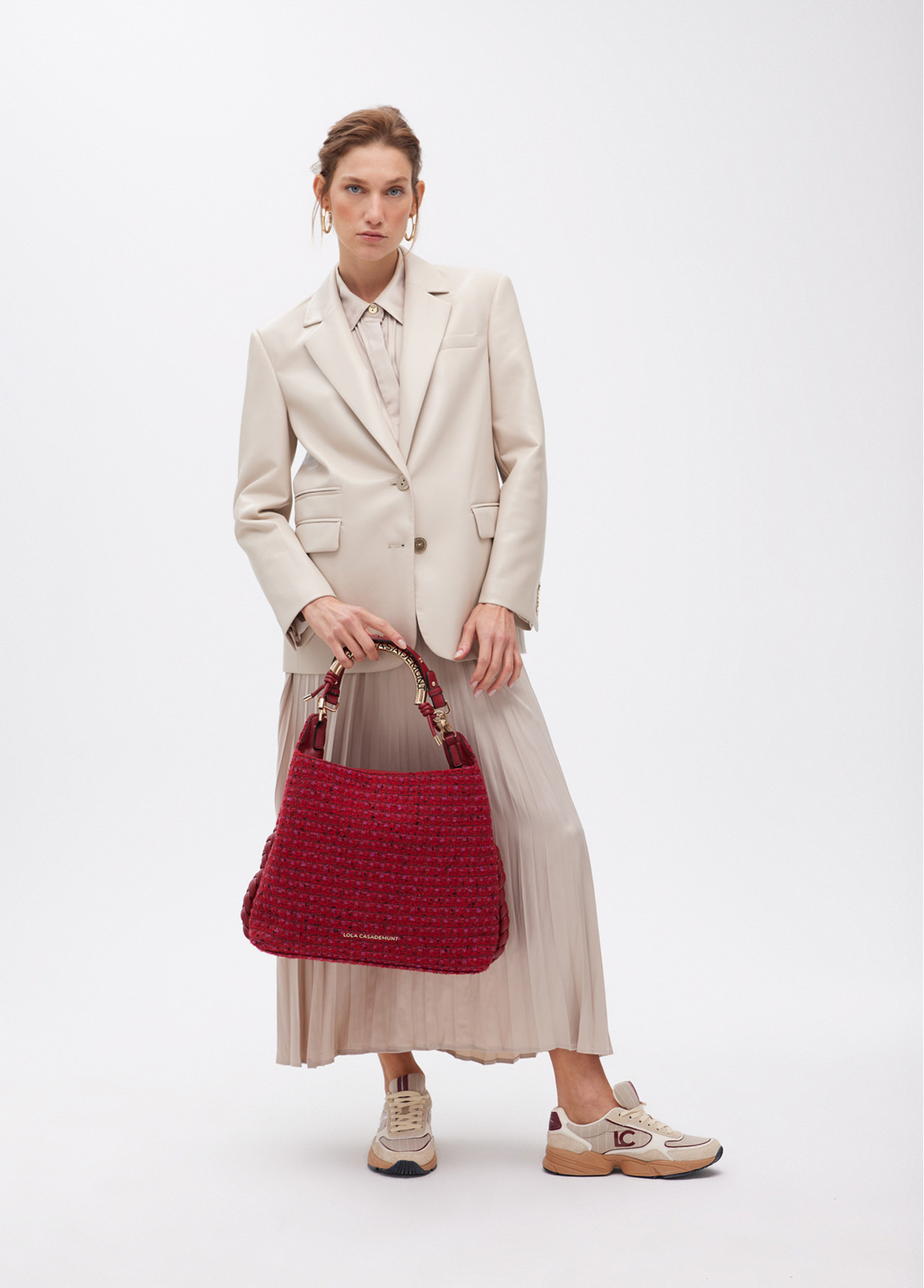 Bolso shopper en tejido tweed de calidad superior. Asa metalizada personalizada y diseño espacioso. Ideal para llevar a diario con estilo y sofisticación. Disponible en color rojo vibrante.