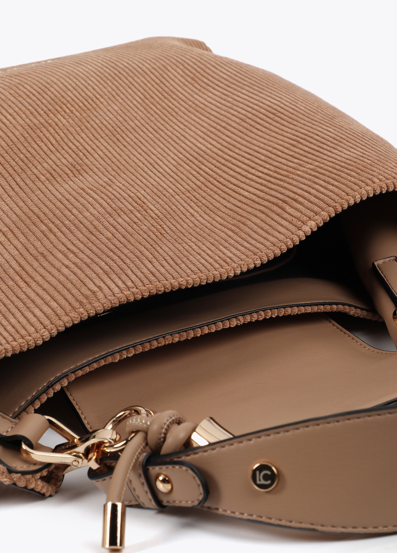 Elegante bolso shopper con tejido acanalado y asa metalizada con logo personalizado. Incluye detalles trenzados laterales y cierre magnético. Espacioso interior ideal para el día a día.