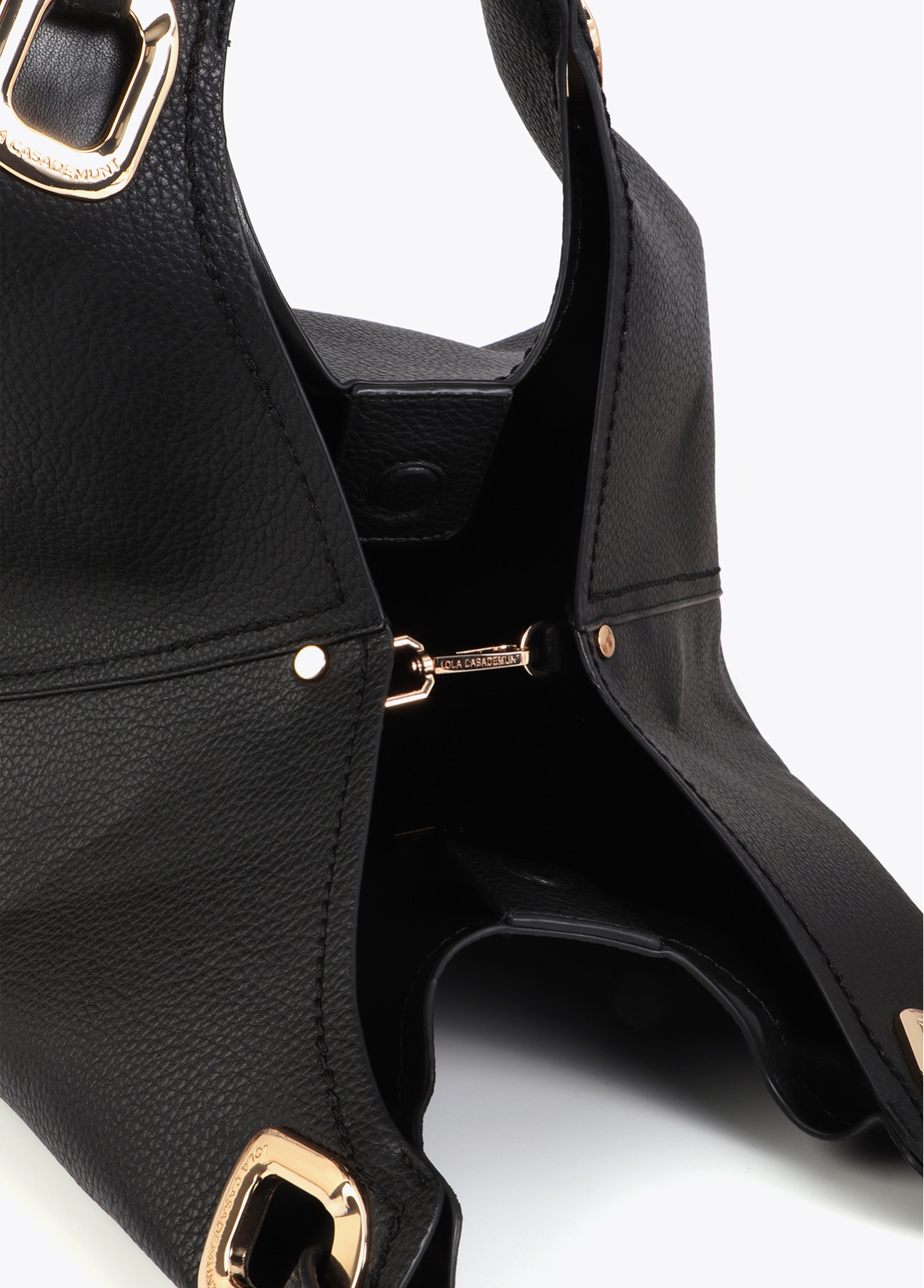Bolso shopper con asa trenzada y detalles metálicos en acabado dorado. Fabricado en piel sintética texturizada, espacioso interior con cierre magnético. Elegante y funcional para el día a día.