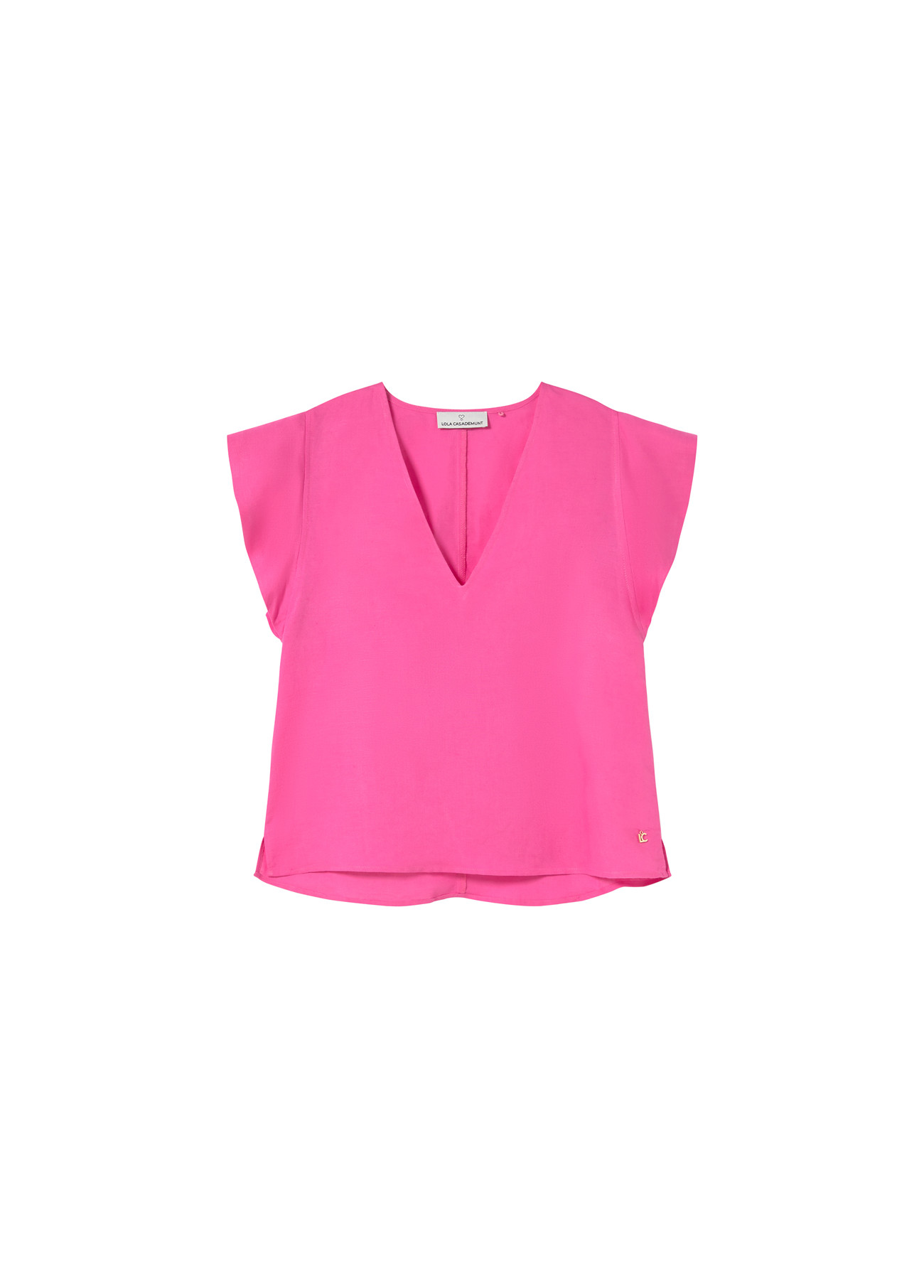 Blusa ligera con manga corta y volantes, confeccionada en tejido suave. Escote en V y corte relajado para mayor comodidad. Ideal para combinar con tus pantalones favoritos y crear un look fresco y moderno.